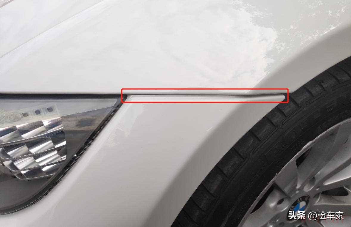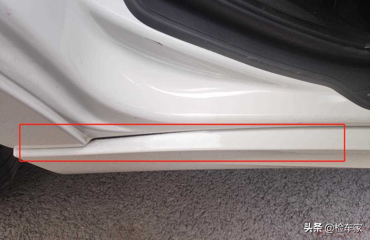 查看右后门周边,下门槛饰板表面存在明显二次喷漆痕迹,扒开右后叶子板内衬,通过缝隙观察发现内部有明显色差,与车辆年限不符,这种情况基本可以确定下门槛饰板更换。
