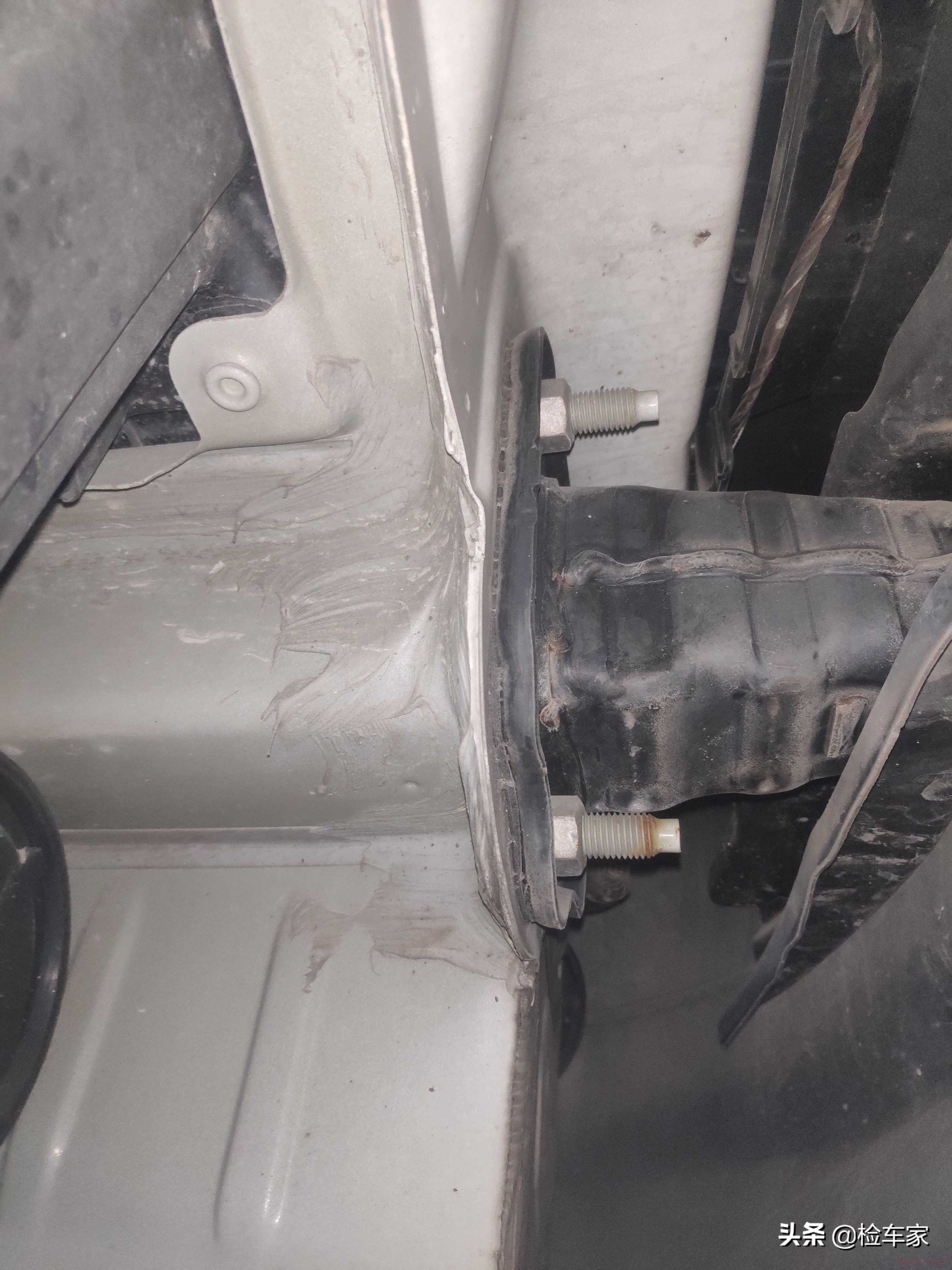 发动机底部左右支架存在更换现象,支架与周围部件有新旧色差,出厂日期为2018年,晚于车辆总装出厂七年,后来仔细观察后发现发动机支架固定在元宝梁上面,要想更换就必须对元宝梁进行拆卸,但也不能蒙蔽双眼,继续检查看能不能发现其他证据。