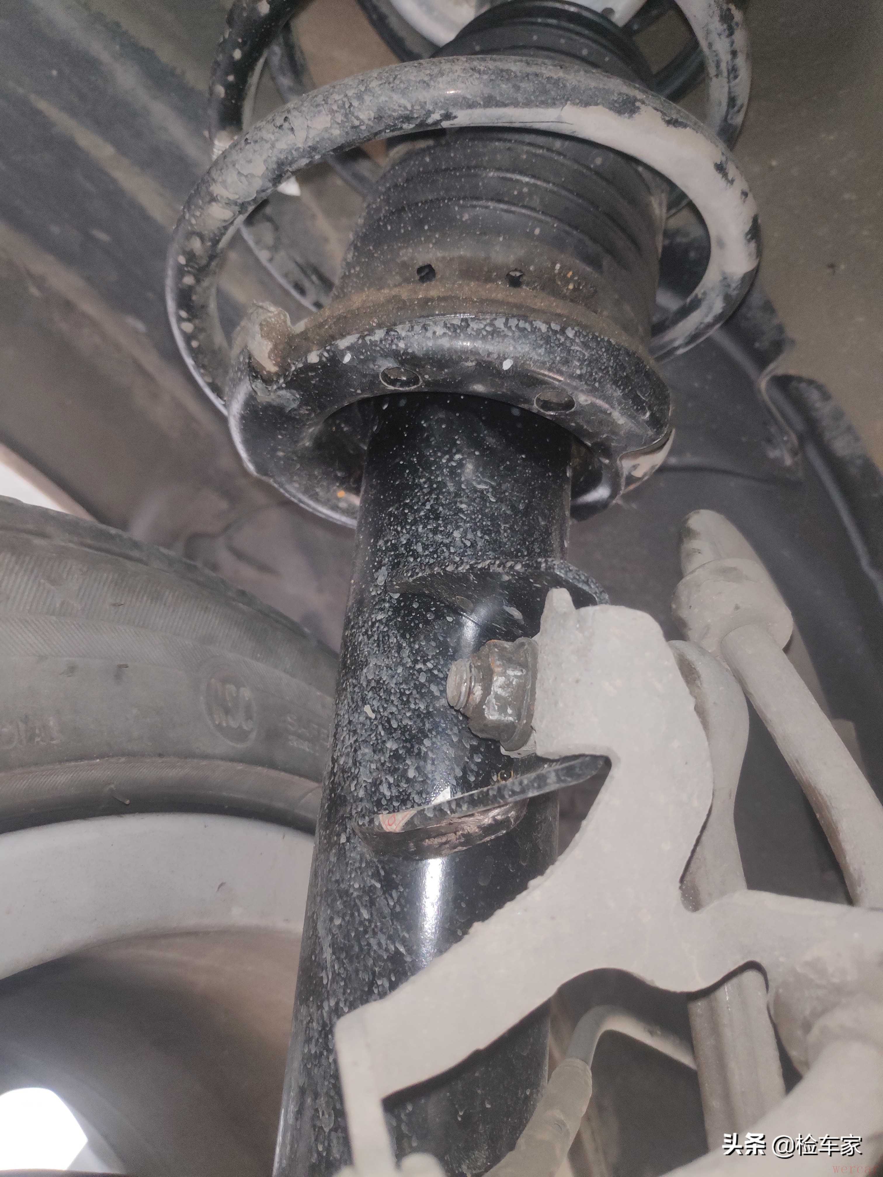先看了前部悬挂部位,发现两侧前减震器有后期更换配件,配件存在明显的新旧色差,且固定螺丝有拆卸特征,对于上了年限的二手车,一些配件更换对下任车主来讲是件好事,不用纠结有过拆卸更换对价格有什么影响,总比入手之后自己掏钱维修好。