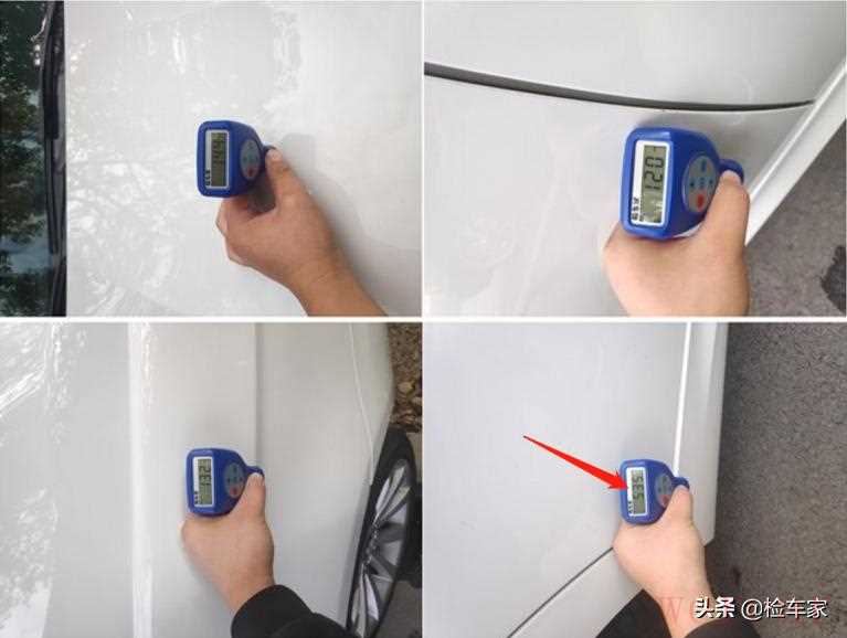 随后借助漆膜仪检测外观金属漆面,令人意外的是,全车仅右后门漆面存在异常,其它金属面都还是原厂漆,开了快十年的车,这技术相当了得啊!那么咱们就来好好研究研究这右后门,右后门局部漆面厚度达到了535μm,而正常原车漆在110μm-150μm之间,数据相差5倍,右后门已经达到了钣金修复范畴,可以定义为钣金修复。