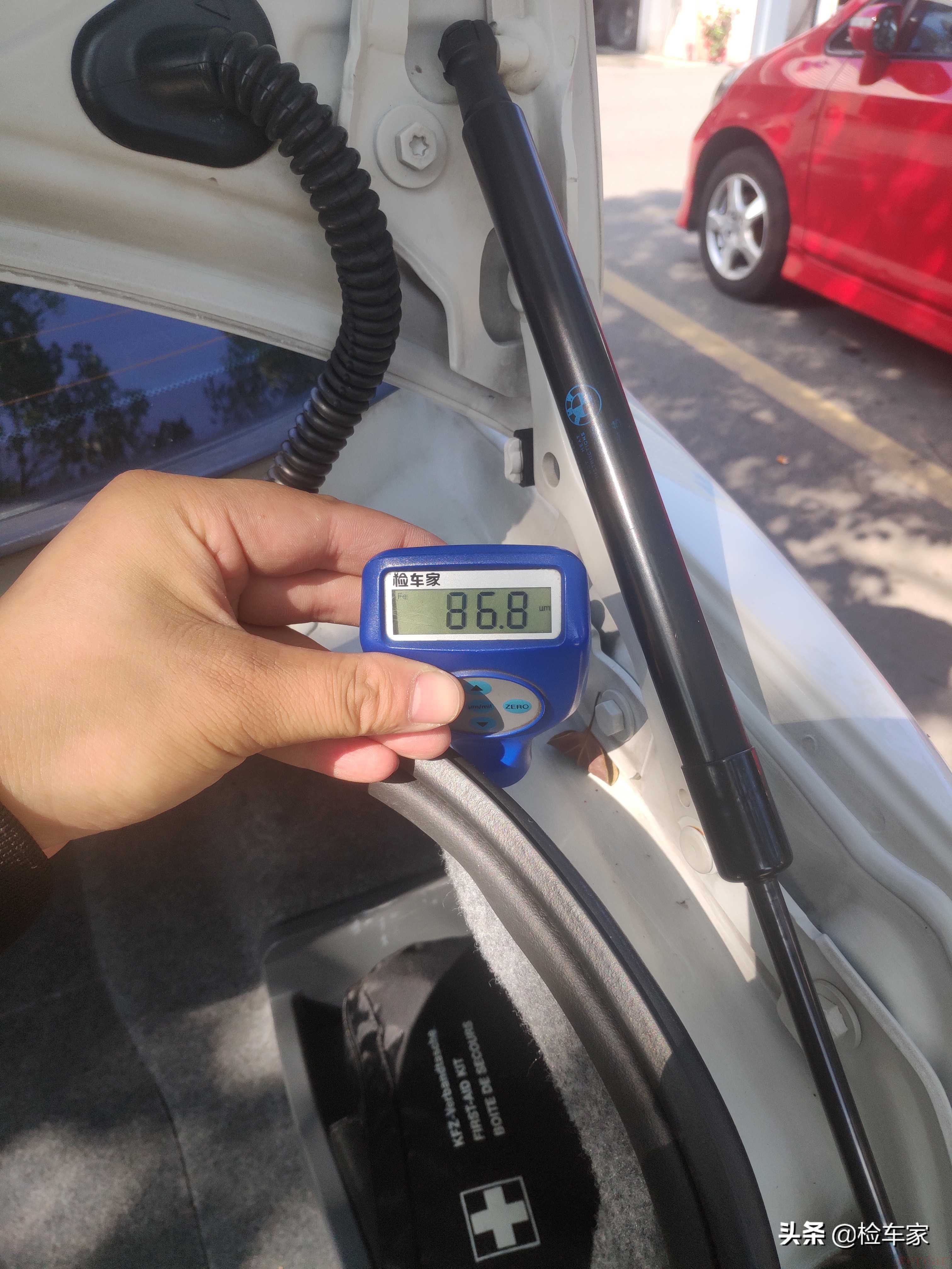 后备箱内部及两侧叶子板流水槽位置检测下来也没有发现焊接痕迹,同时漆面平顺无二次喷漆现象,漆面厚度也符合原厂标准,车身后部的严重追尾事故可以排除。
