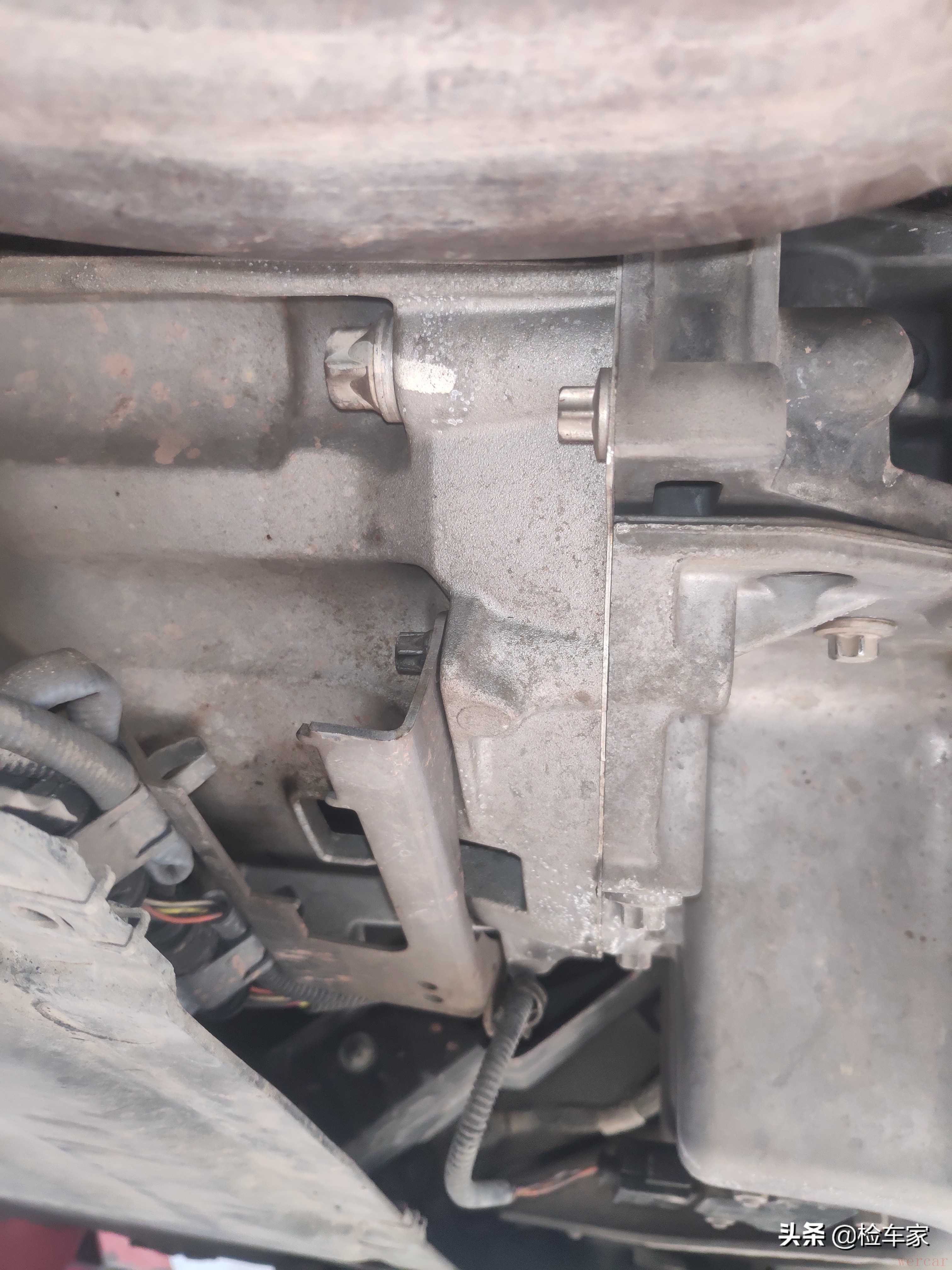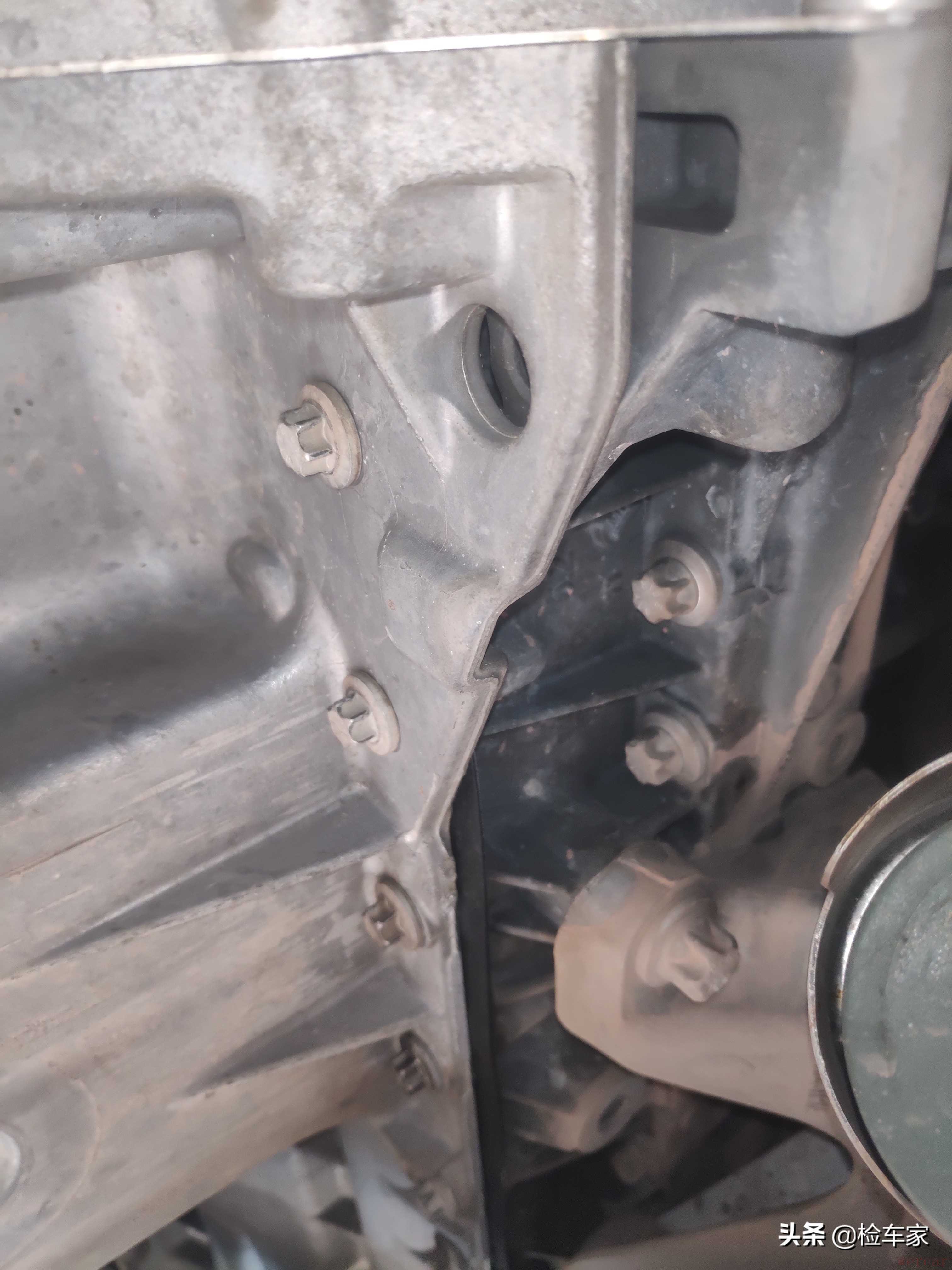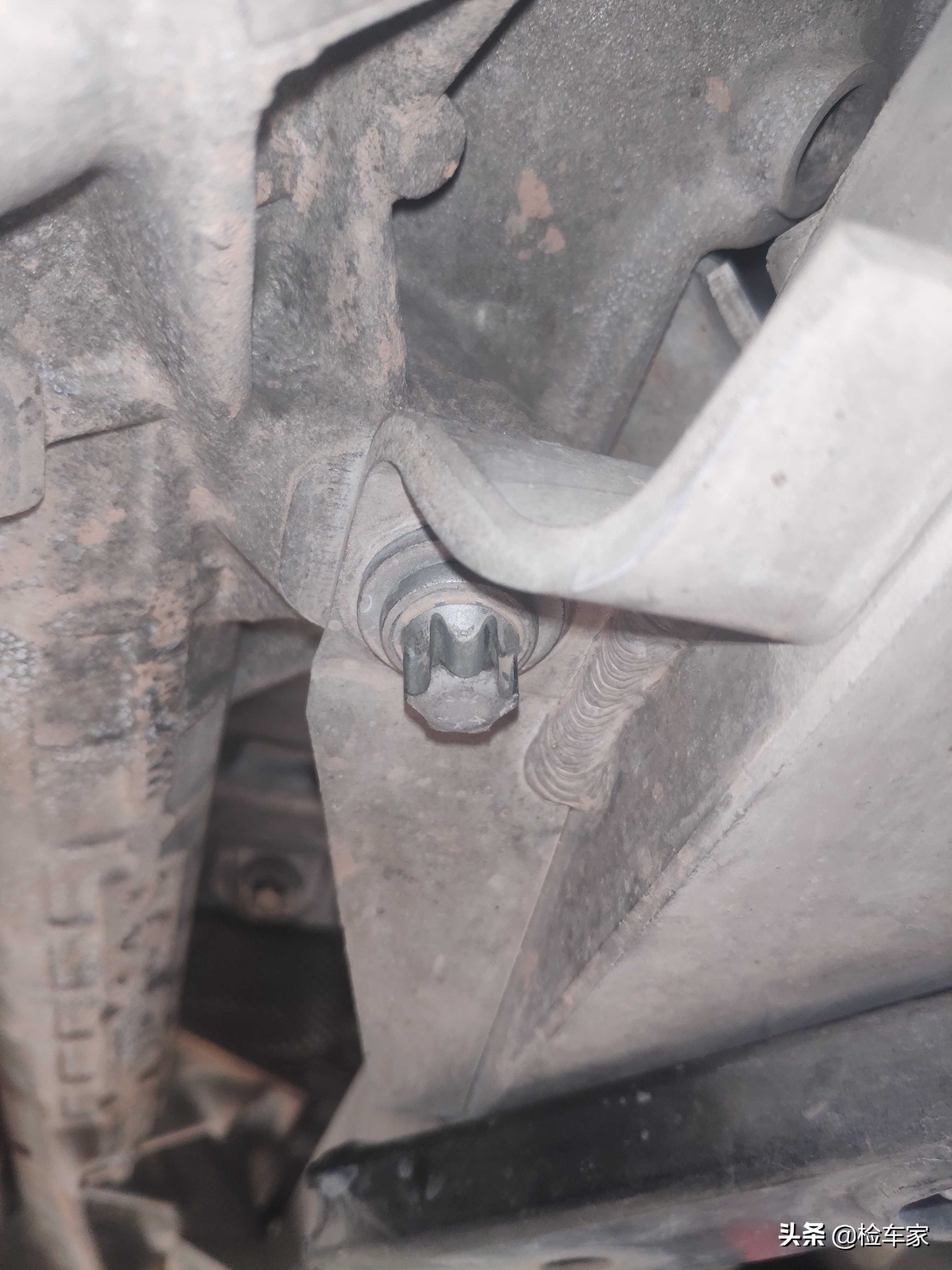 变速箱底部固定支架螺丝目前没有异常的拆卸拧动痕迹,变速箱支架没有拆卸也就进一步证明变速箱没有吊装现象。变速箱和发动机是连接在一起的,变速箱没有吊装,发动机也就无法吊装拆卸维修,所以说一些问题不能太单一的去判断,要全方位推理去分析。