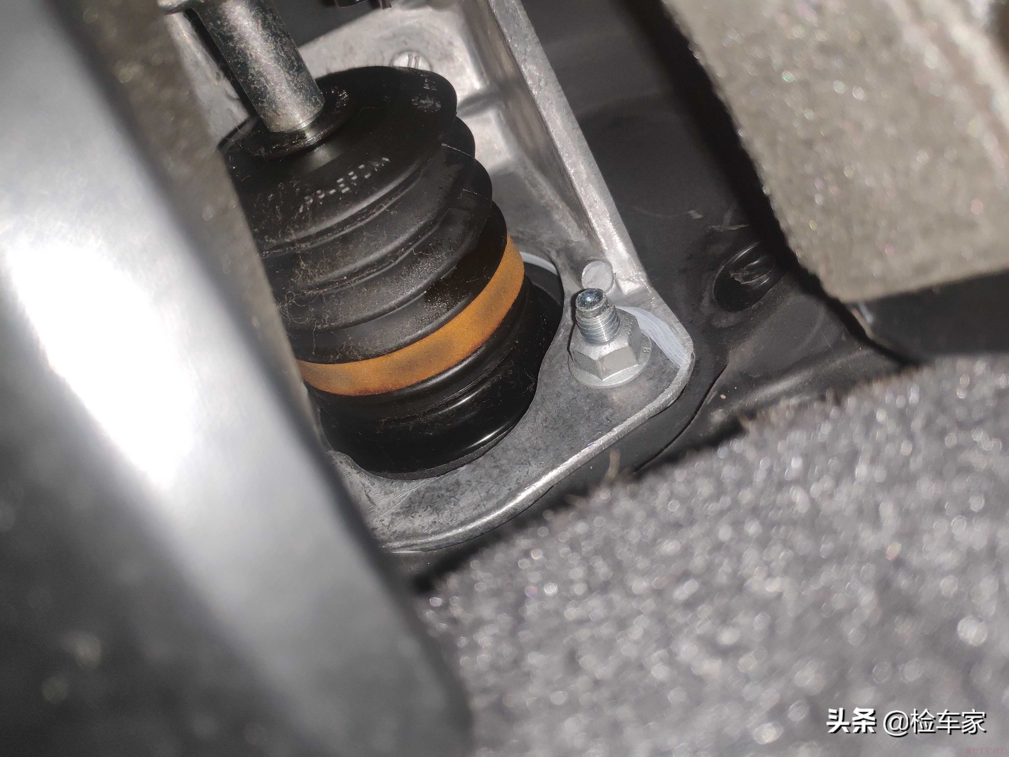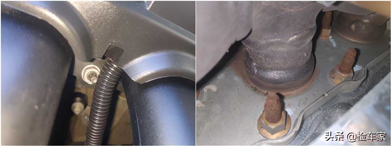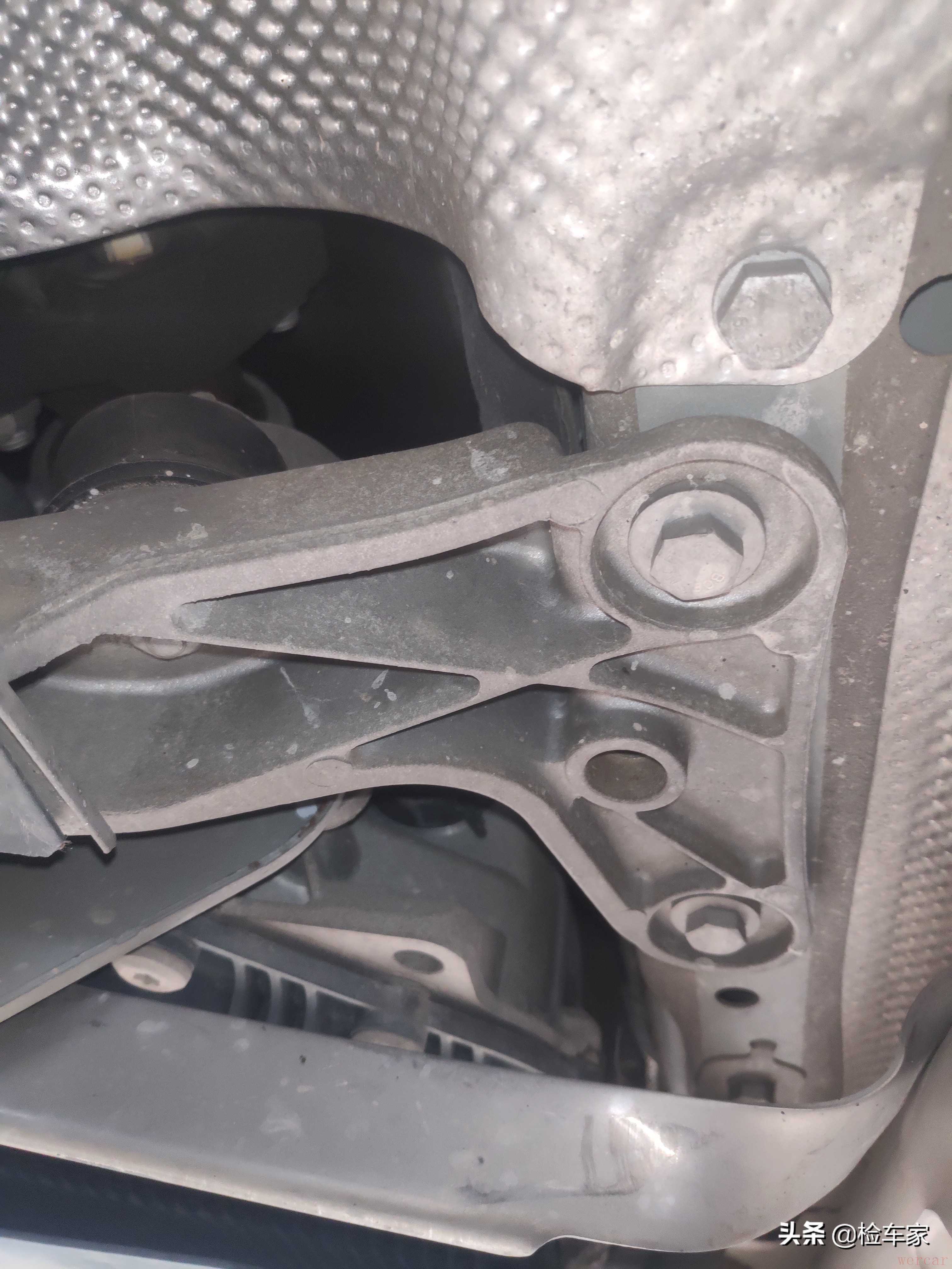 变速箱底部固定支架螺丝目前没有异常的拆卸拧动痕迹,变速箱支架没有拆卸也就进一步证明变速箱没有吊装现象。变速箱和发动机是连接在一起的,变速箱没有吊装,发动机也就无法吊装拆卸维修,所以说一些问题不能太单一的去判断,要全方位推理去分析。