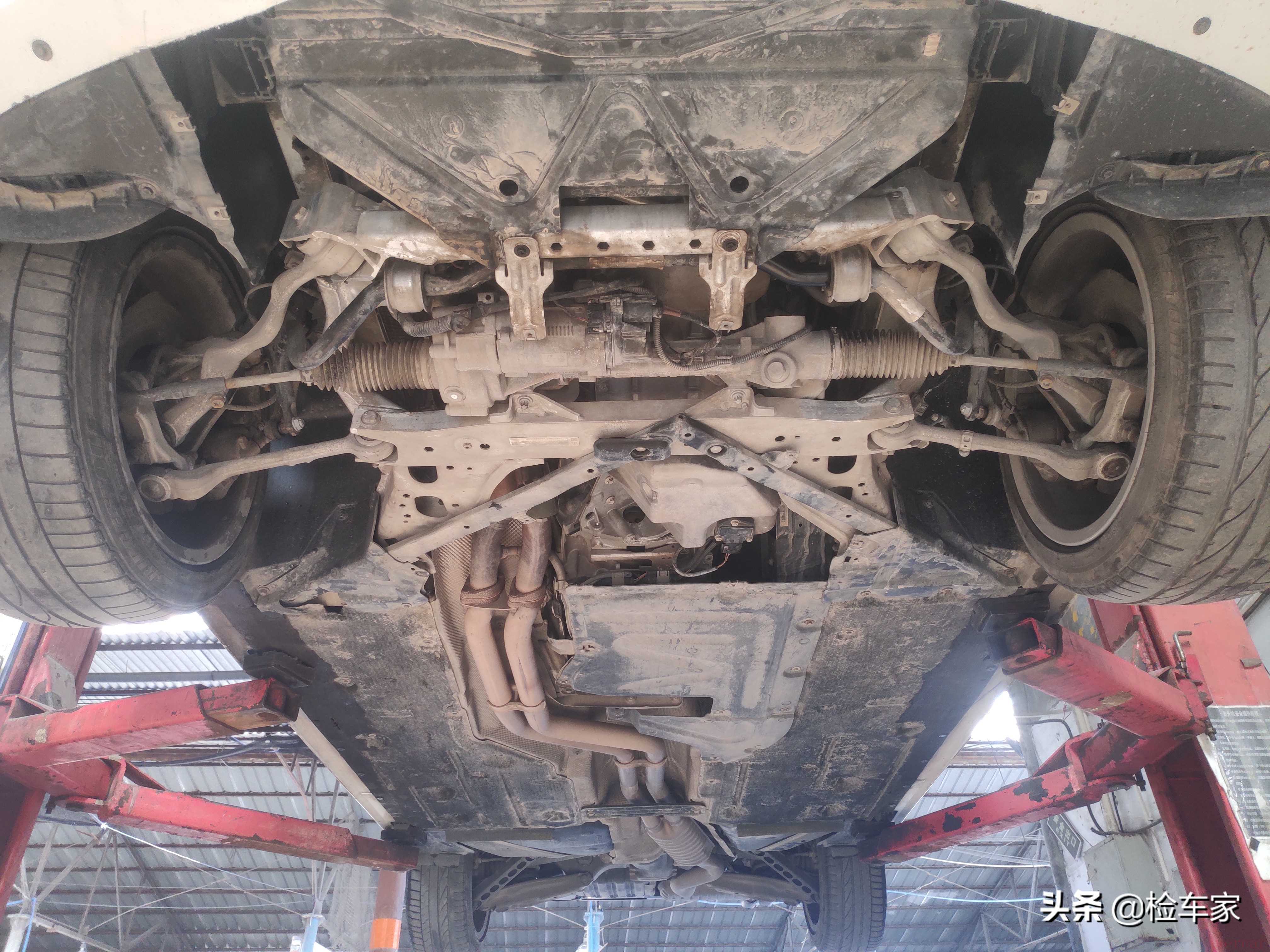 将车开到事先约好的修理厂上架对底盘进行检测,升起来后可见底盘没有严重的托底和渗油现象,不过这样的成色看起来就有些年头了,不像外观内饰那样新,但是底盘的状态感觉还是比较不错的。