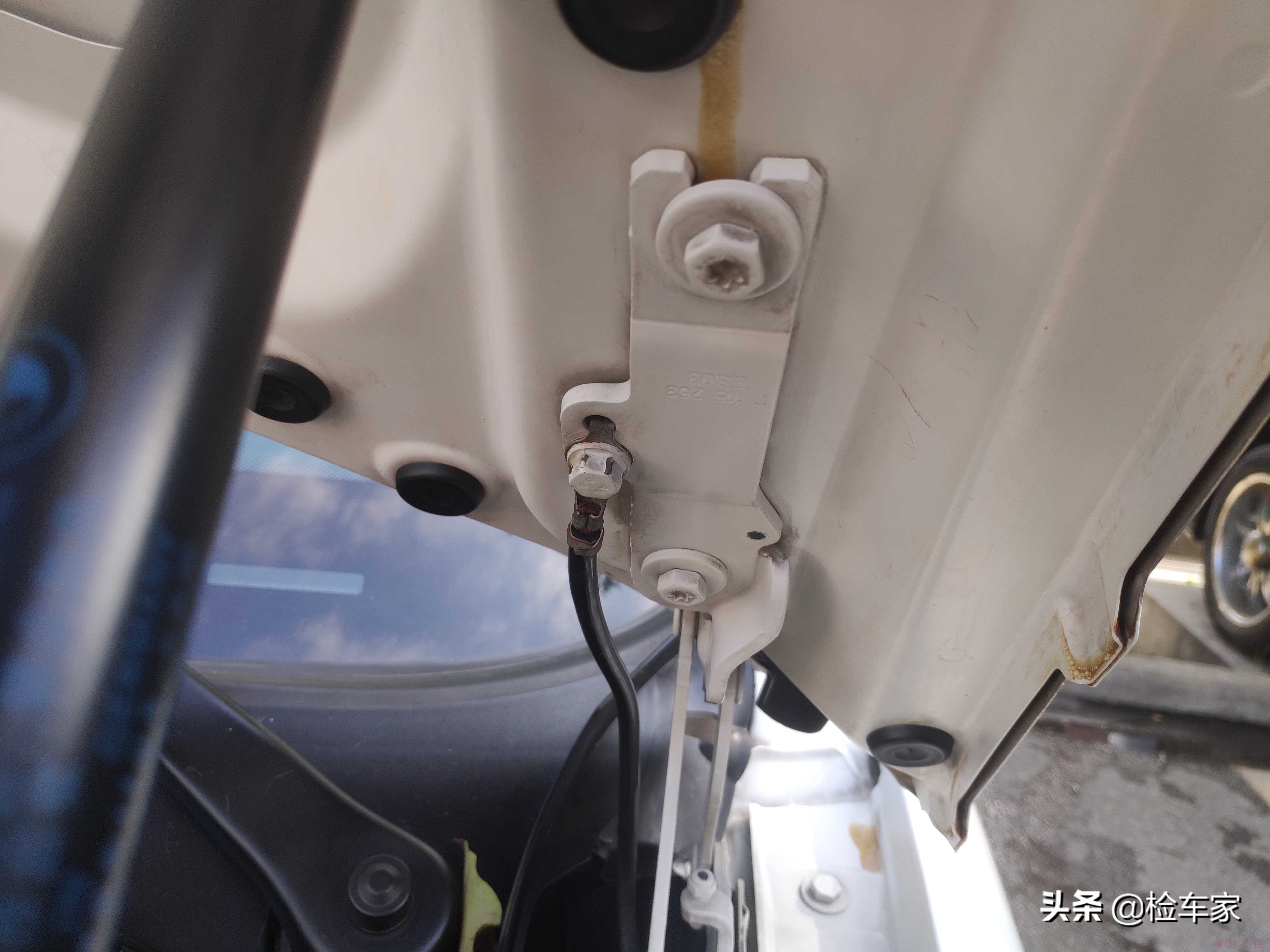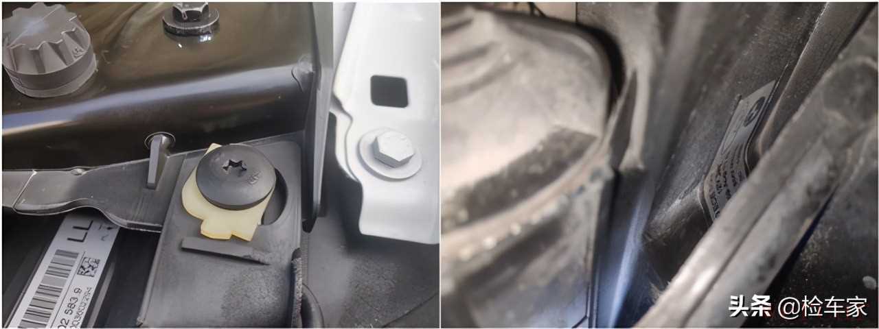 两侧叶子板固定螺丝及减震器塔顶固定螺丝不存在拆卸拧动痕迹,同时叶子板加强梁和减震包也没有异常受损修复现象,漆面平顺无褶皱敲打痕迹,基本可以确定为原厂,排除机舱两侧的严重撞击事故。