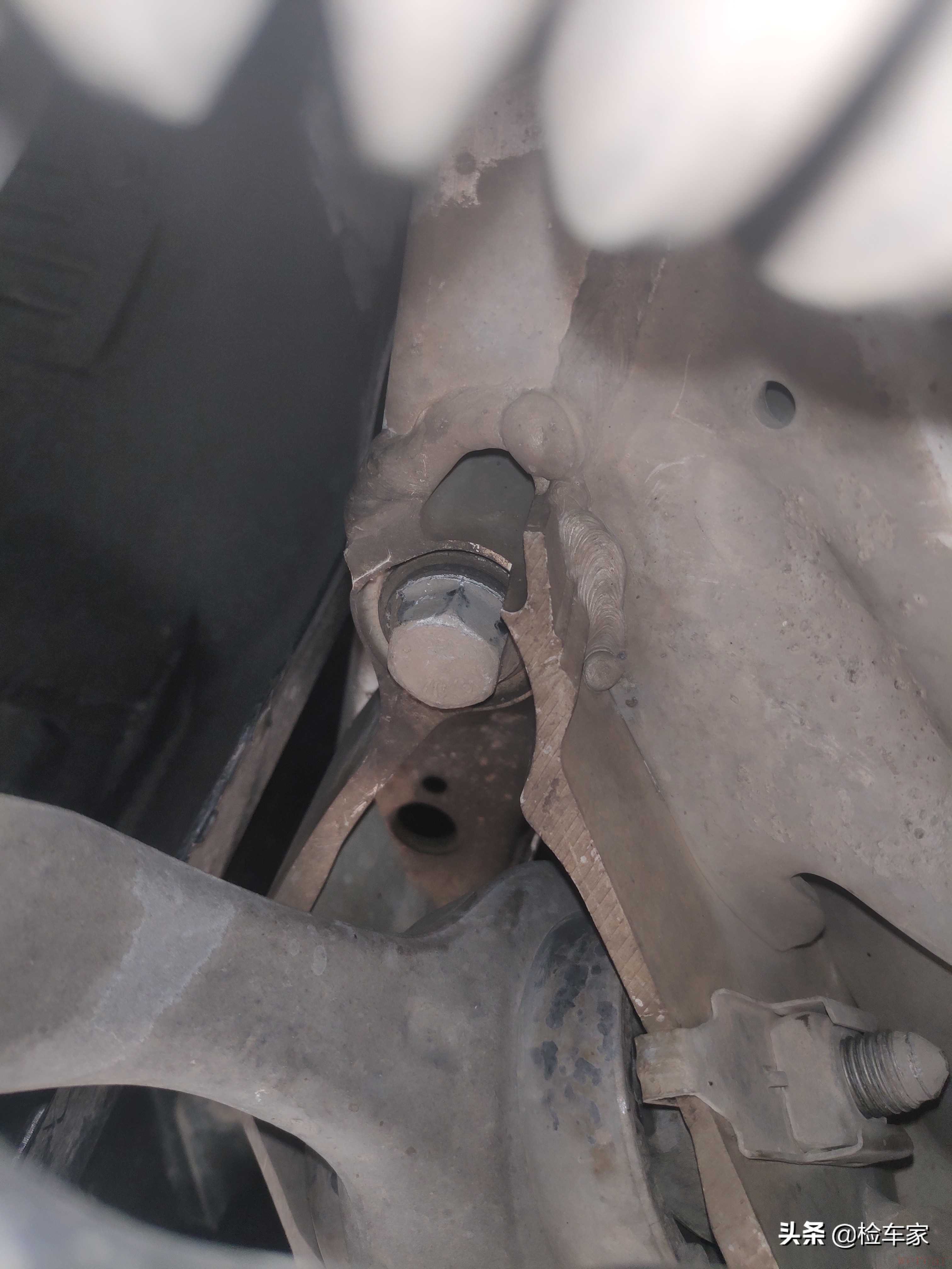 发现问题就要一探究竟,随后发现转向机固定螺丝也存在明显拆卸痕迹,但转向机出厂日期与车辆总装出厂时间相符,排除更换嫌疑,转向机是固定在元宝梁顶部,拆卸元宝梁就要对转向机进行拆卸,属于附带拆卸。