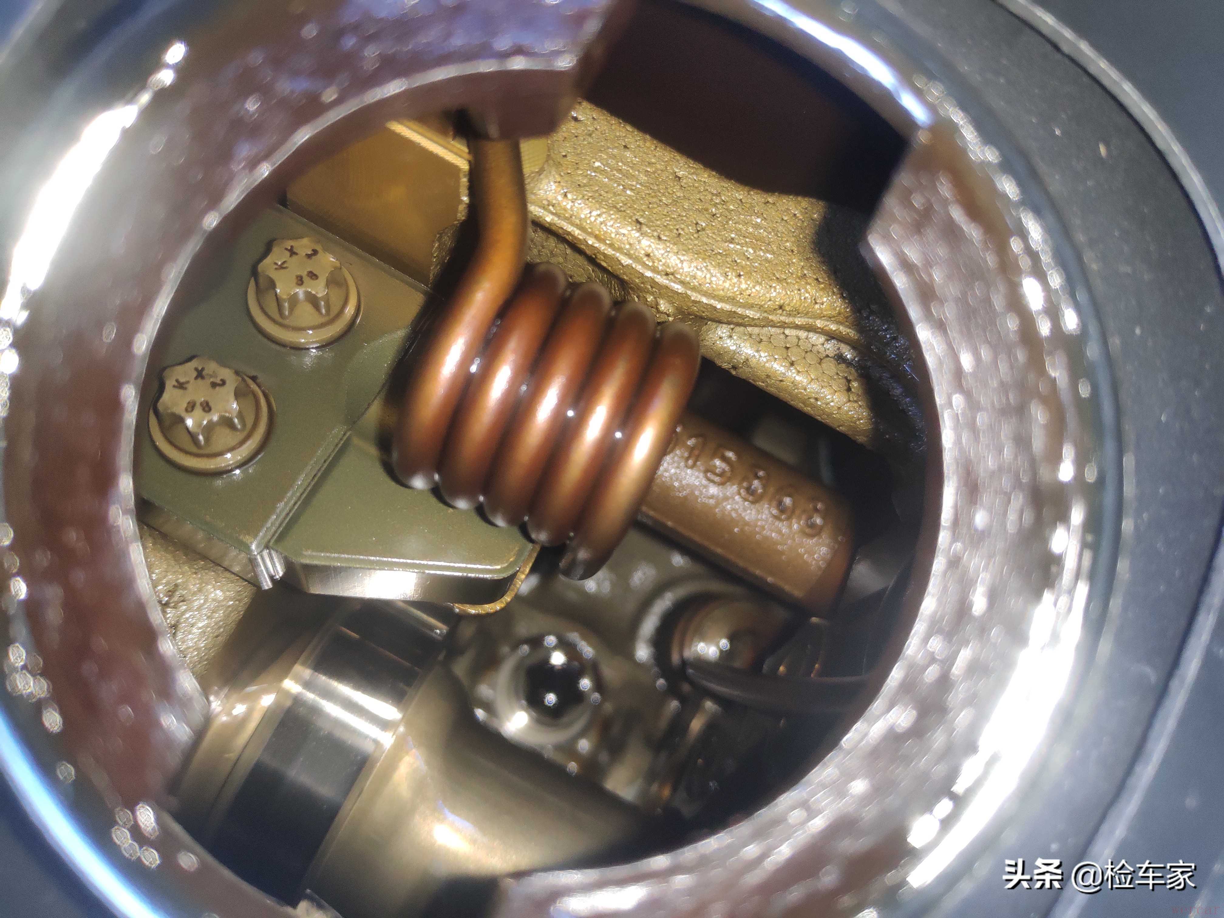 打开机油盖通过机油加注口观察发动机内部没有发现异常的积碳或油泥,同时也可以观察到发动机顶部进排气凸轮轴及零配件的固定螺丝,如图清晰可见固定螺丝目前均不存在拆卸痕迹,进一步排除发动机分解维修嫌疑。