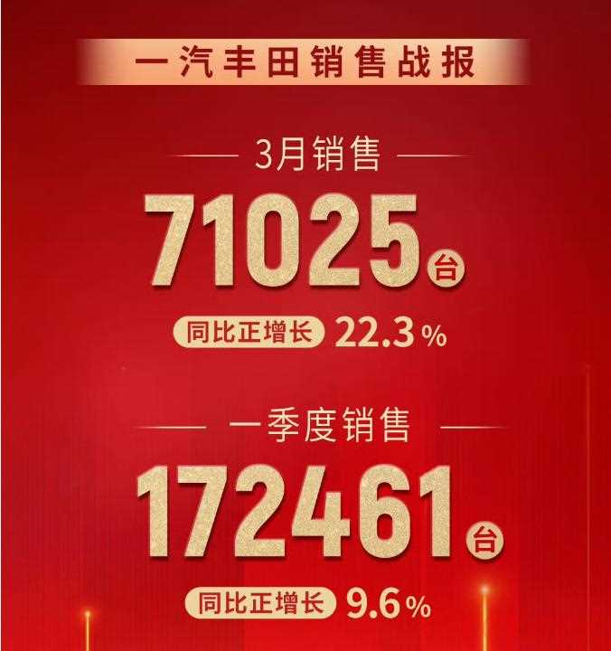 这种积极的态度,在市场上也得到了良好的反馈。新能源大背景下,诸多合资品牌持续下跌,一汽丰田一季度的零售销量却逆势上涨了9.6%,3月份单月销量更是大涨22.3%,销量表现,也是产品力和口碑的综合体现。