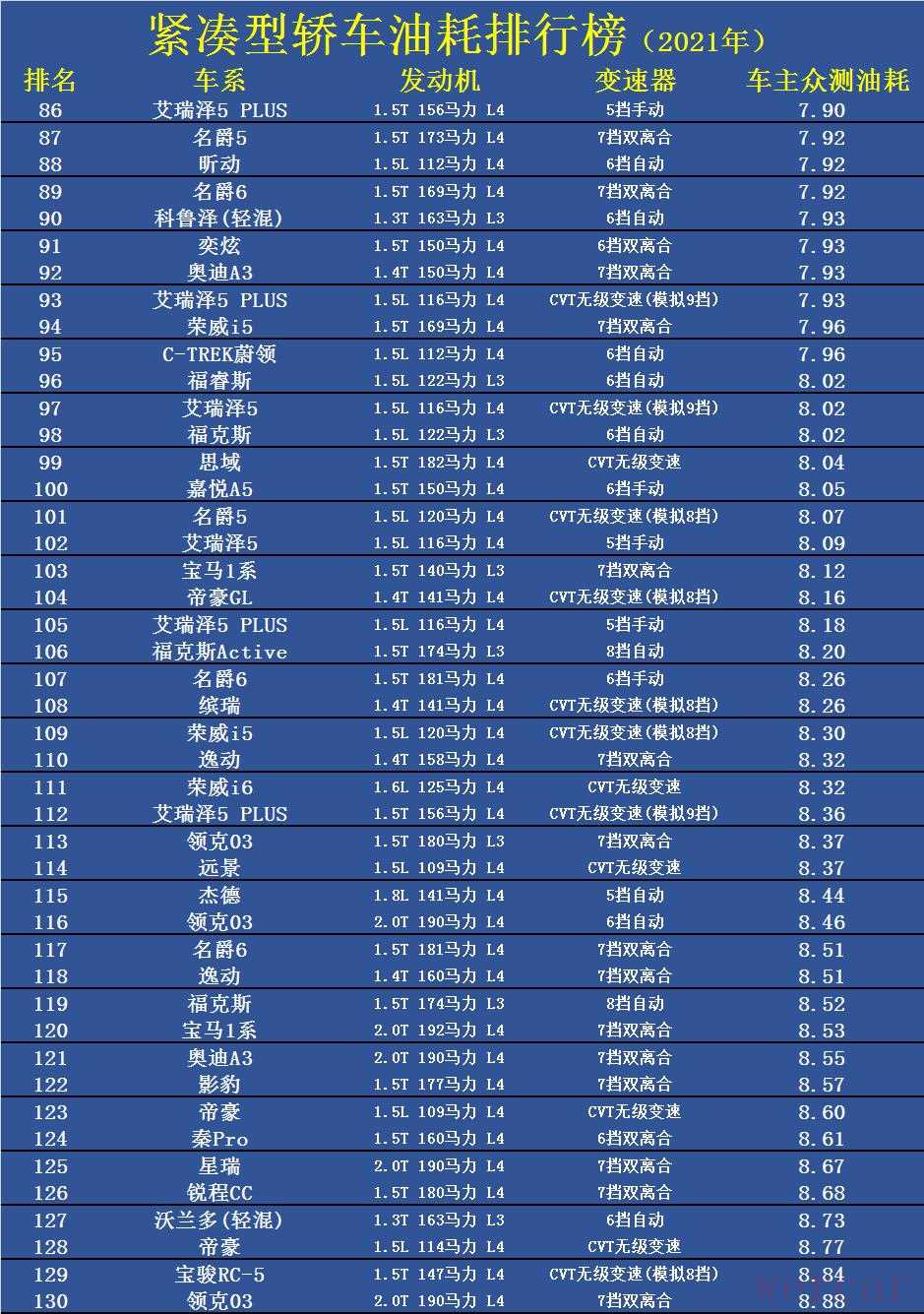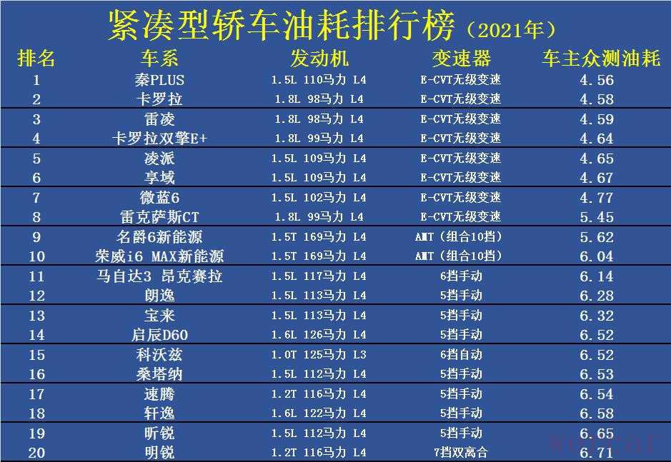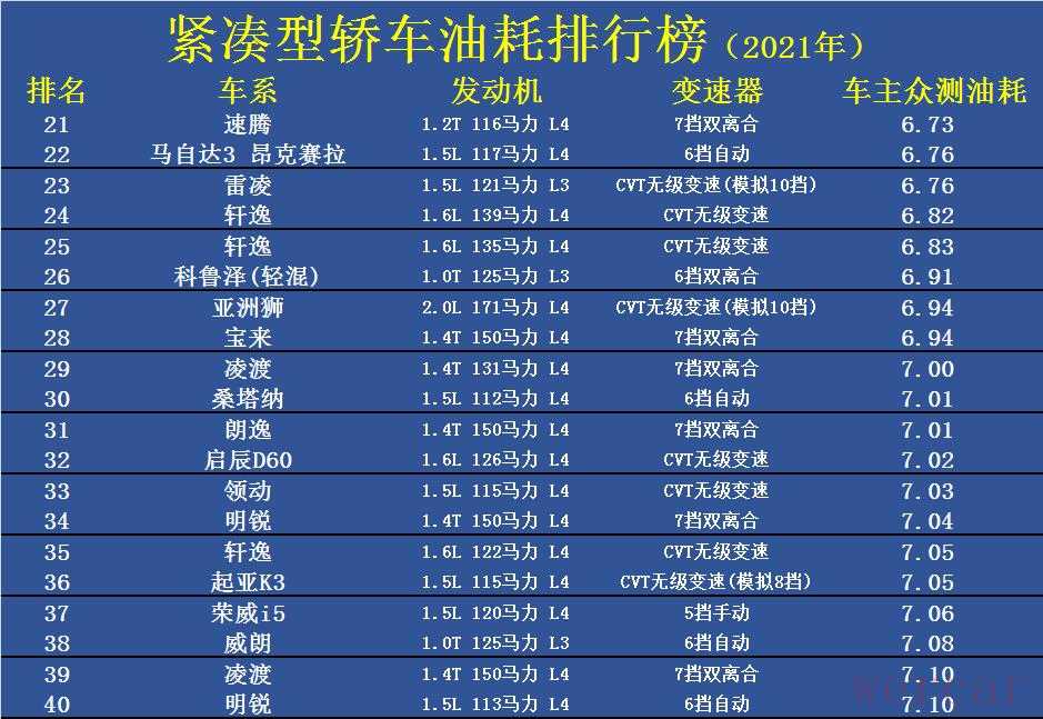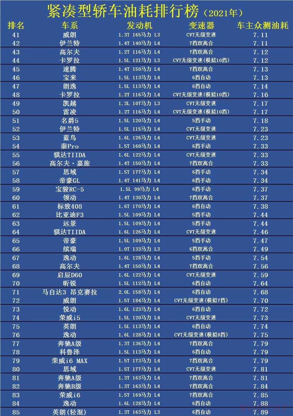 2、再来看下纯燃油车型的表现,手动挡车型比较省油,马自达3 昂克赛拉、大众朗逸和大众宝来都排名前十五,而且百公里油耗低于6.5L。朗逸是三大主流轿车之一,其2021年总销量接近40万辆,其性价比表现比较出色,油耗更是其“制胜法宝”。大众速腾和日产轩逸也都排名前二十,日产轩逸是轿车“销量王”,它的手动挡车型平均油耗只有6.58L,确实非常省油。