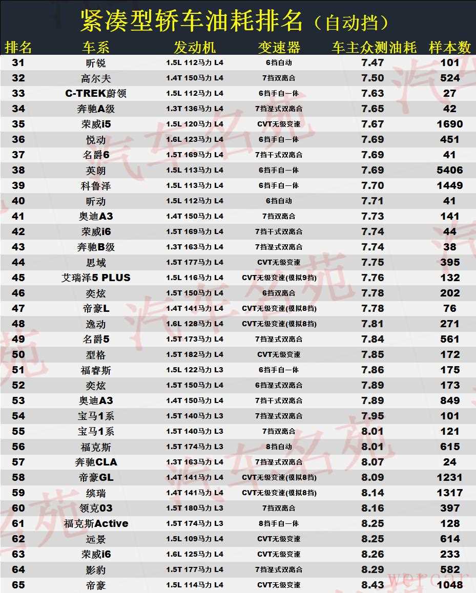 最后,油耗超过7.5L的轿车车型还有33款,它们多为大功率合资轿车或者自动挡国产轿车,比如大众高尔夫、奔驰A级、现代悦动、别克英朗、本田思域、本田型格、福特福睿斯、宝马1系以及福特福克斯等。而自动挡国产轿车比较知名的有,荣威i5、名爵6、奇瑞艾瑞泽5 PLUS、长安逸动、名爵5、东风奕炫、吉利缤瑞、领克03、传祺影犳以及吉利帝豪等,吉利帝豪排名垫底,百公里油耗为6.43L。