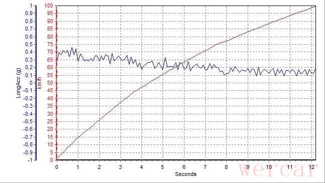 为了了解它的性能,我们也对它进行了性能测试。测试前,我们先将驾驶模式切换至Sport,并手动关闭车身稳定系统,然后采用左脚刹车右脚油门的方式进行弹射起步。经过多次测试,最终现代悦动的百公里加速最佳成绩为12.29秒。
