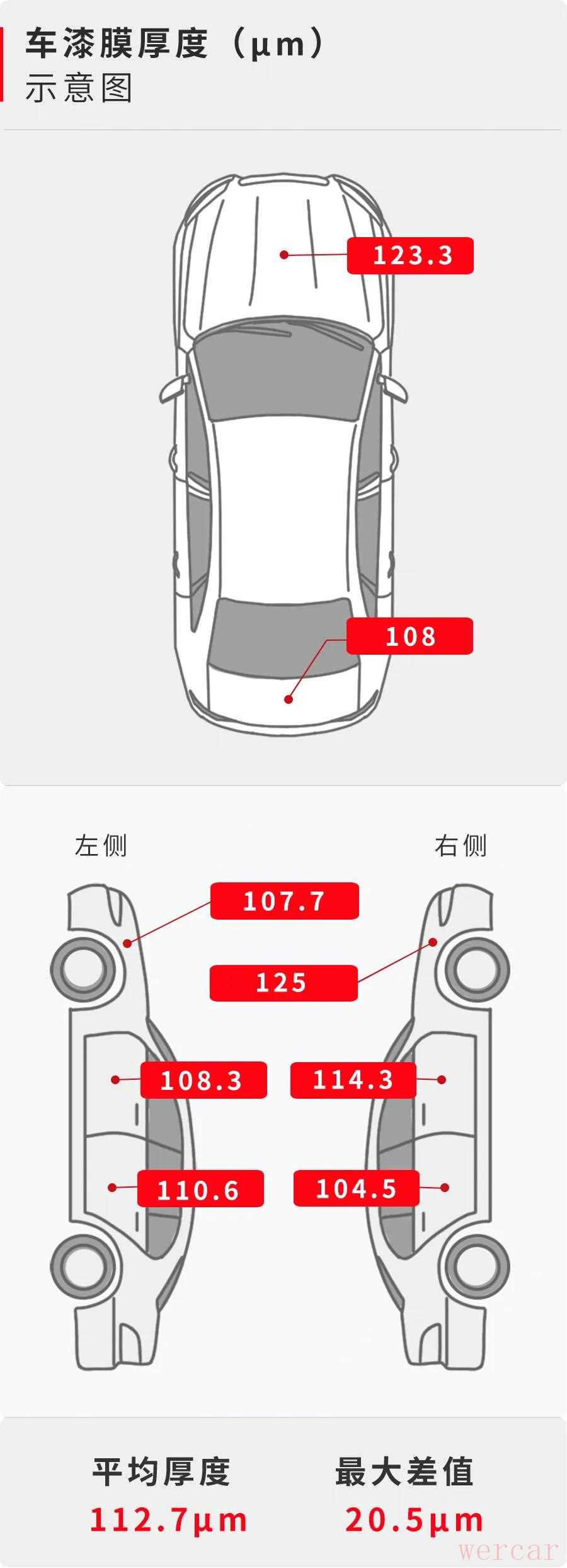 漆膜厚度方面,经实测,现代悦动的漆膜平均厚度为112.7μm,车身漆膜厚度偏薄。漆膜最大差值为20.5μm,整体漆膜喷涂较均匀,车漆喷涂工艺较为成熟。