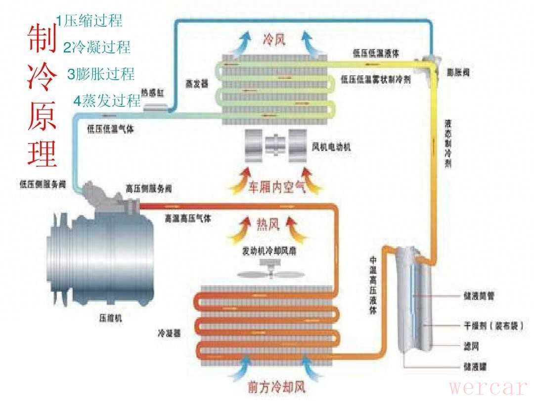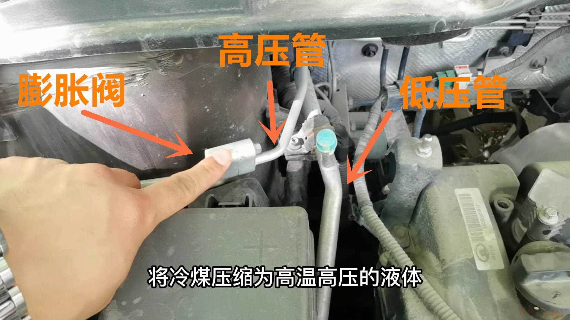 发动机曲轴轮通过皮带将动力传输到空调压缩机,粗的是空调低压管,细的是空调高压管,空调压缩机将冷媒压缩为高温高压液体,经过冷凝器后变为中温高压液体,通过高压管经过膨胀阀,膨胀阀的作用是控制冷媒流量,将液态冷媒气化后进入蒸发箱,气化吸热,蒸发箱周围空气温度降低,鼓风机将外界空气吸入经过蒸发箱降温后,进入到车内,形成冷风,低压气体冷媒沿低压管路重回压缩机,往复运行,为车内提供冷气。