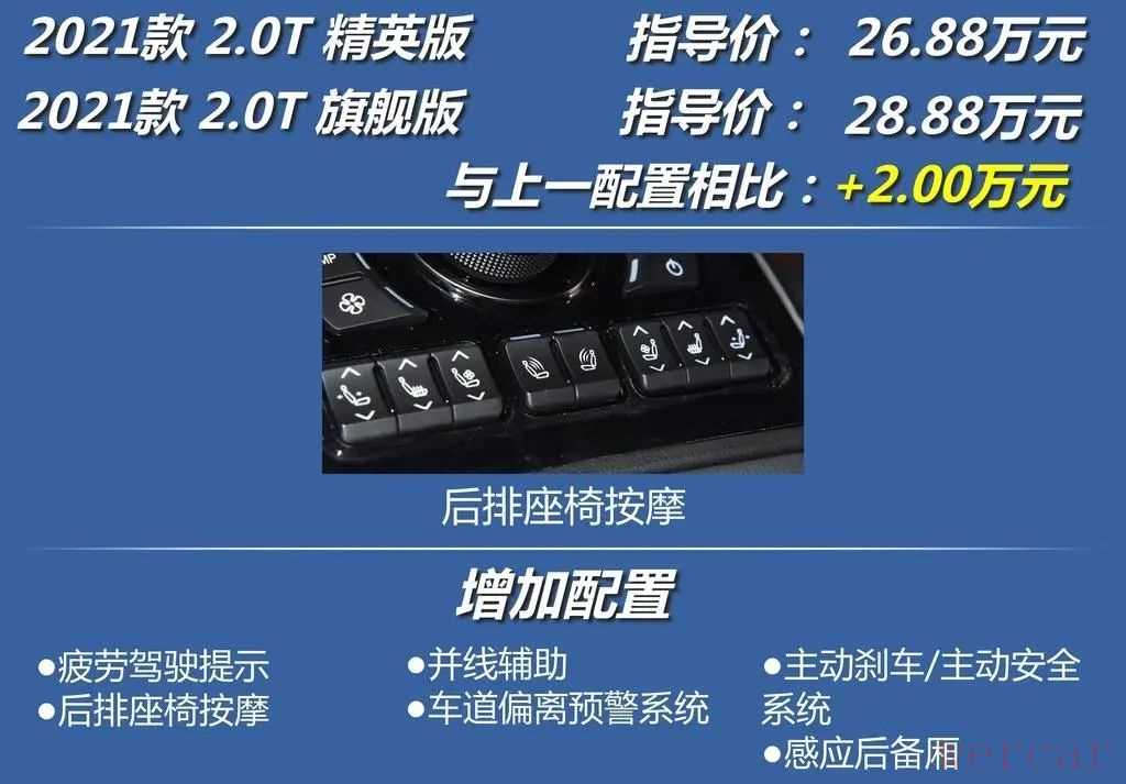 最后推荐顶配2021款 2.0T 旗舰版,虽然它的指导价已经接近30万了,但配置方面也是相当丰富,而且这些配置都集中在提升后排乘客的舒适性上。