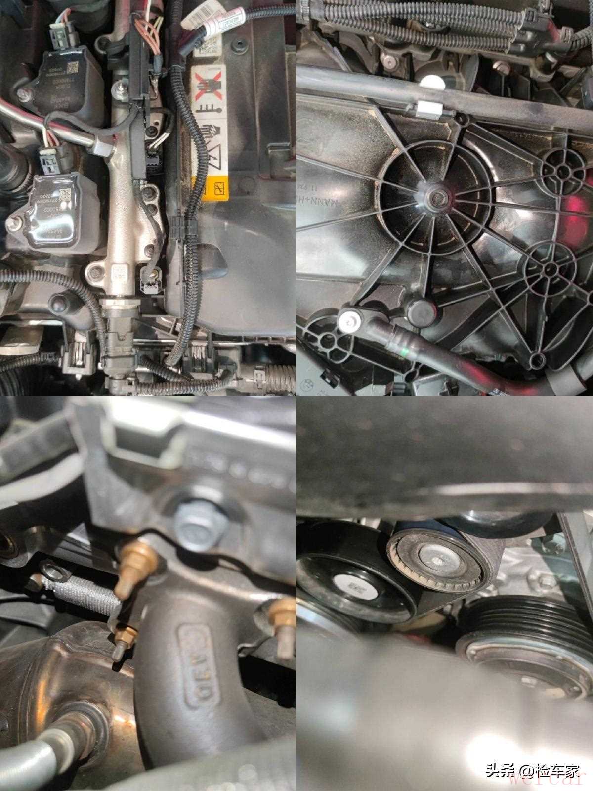 发动机部分,可以看到发动机的气门室盖、进气歧管、排气歧管和发动机前盖,均没有拆卸和渗漏,毕竟公里数搁那儿摆着呢,情况良好。