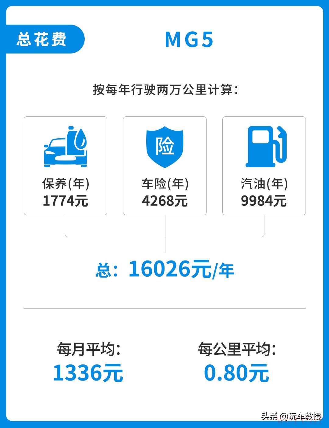 结合保养、保险、油费综合计算,MG5一年的养车成本为16026元,平均算下来每个月的养车支出为1336元。当然这还是未算上停车费等一系列后续额外支出的费用。车辆产生的额外消费再试个人用车环境增加即可。