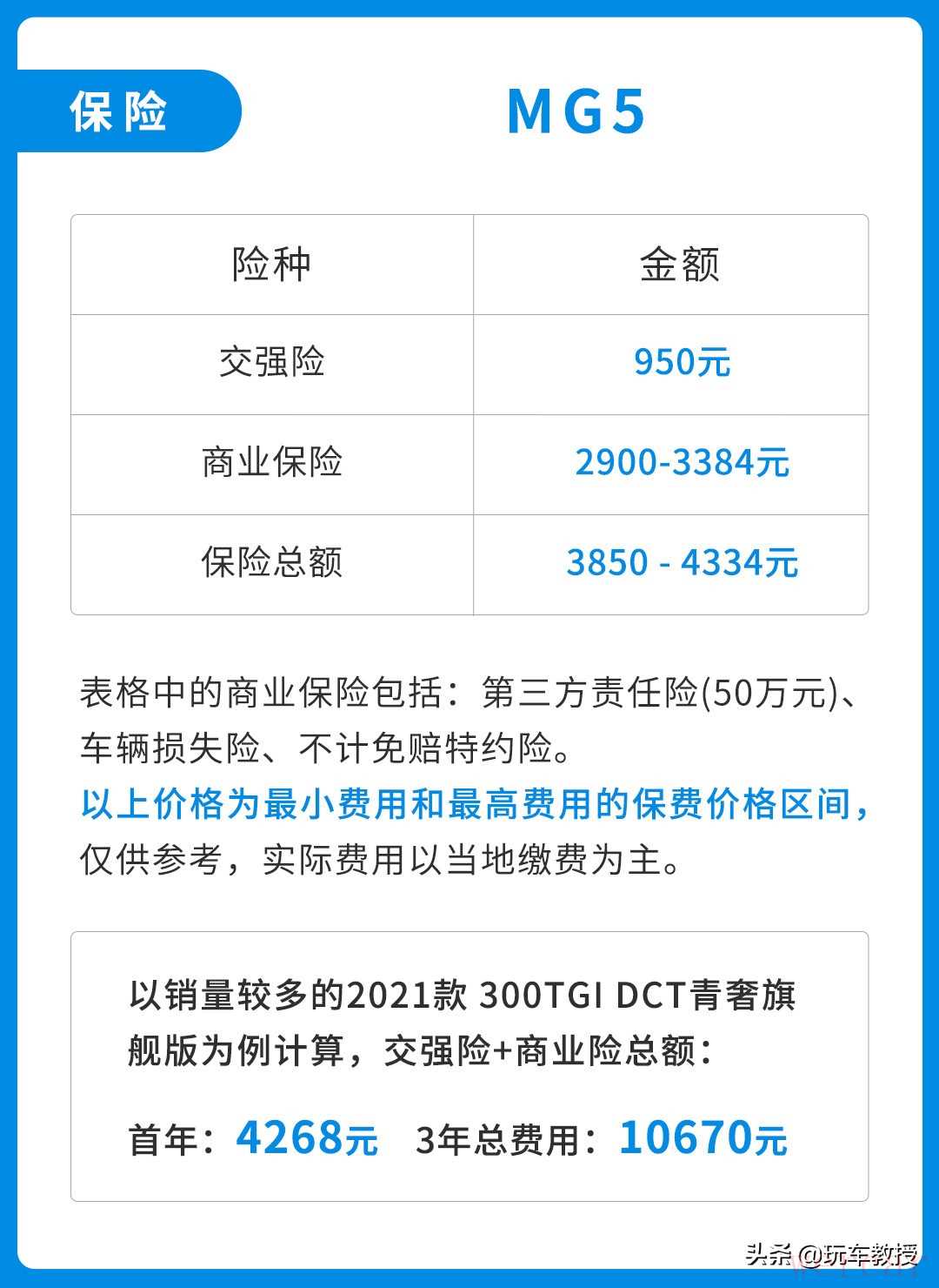 在保险方面,车辆保险金额随车价而改变,但考虑到本身MG5的车价就不高,因此保险方面每年的花销并不大;而且如果没有出险的话,后续的保险费用会逐年下降。以消费者购买意向较高的300TGI DCT青奢旗舰版计算,在3年未出险的情况下,该车在保险方面的花销为10670元,其中首年的费用为4268元。