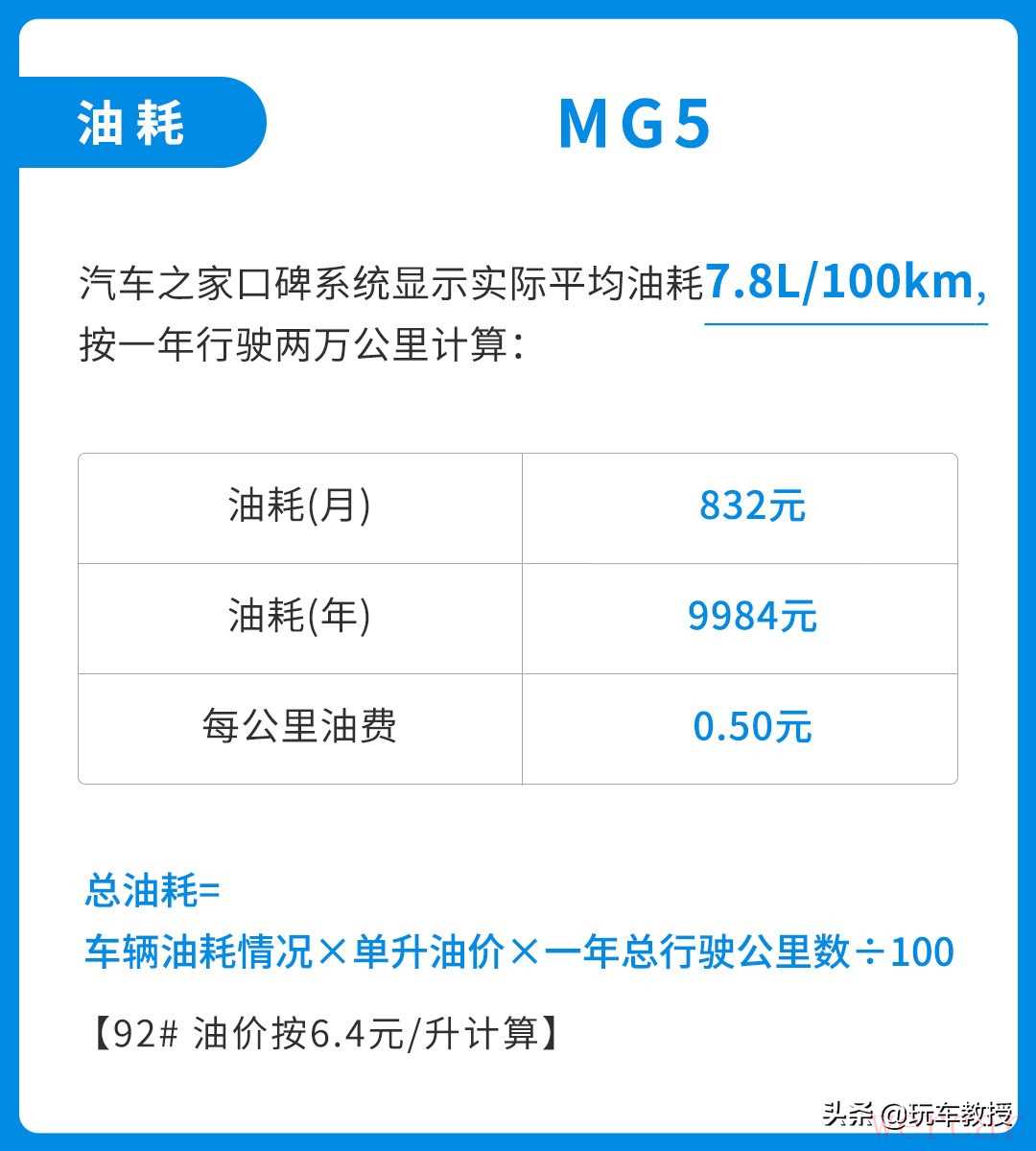 而在养车方面开销最大的燃油方面,MG5的实际百公里油耗为7.8L。按照每年行驶20000公里来计算,一年下来车辆在燃油方面需要花费9984元。