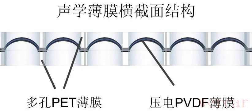 这些圆顶微结构是采用真空压纹工艺加工在超薄的聚偏二氟乙烯压电薄膜上,把这个压电薄膜夹在两片多孔PET(聚对苯二甲酸乙二醇酯)材料中间,相当于给圆顶创造了一定的空间,使它们始终悬空,并且可以自由振动。