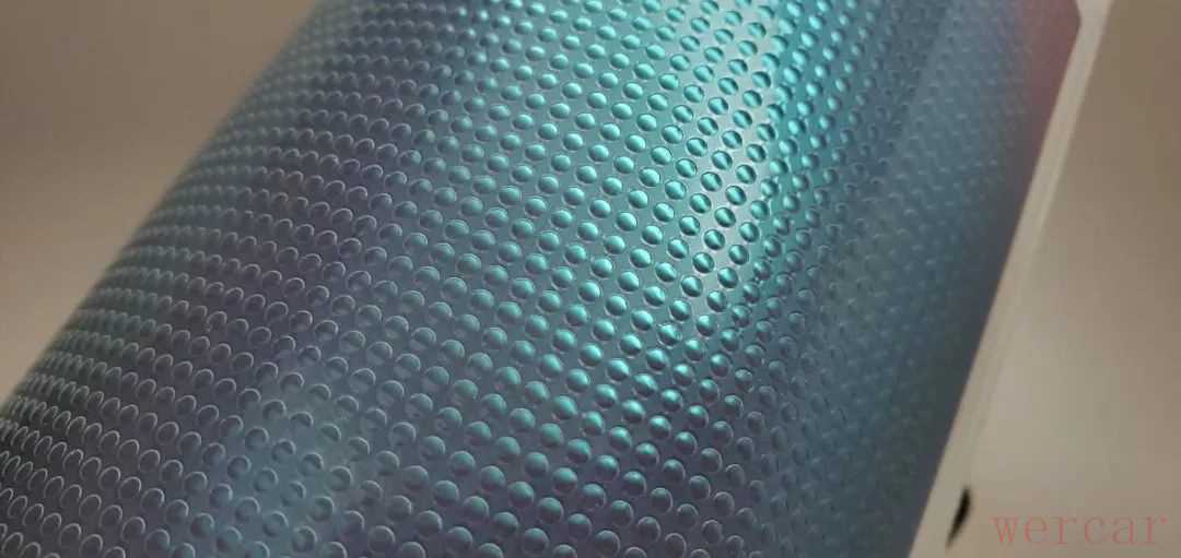 每个小圆顶高约15微米,还不及一根头发的厚度。压电材料的厚度只有8~12微米。PET的厚度是50微米。虽然叠加了这么多材料,但整个声学薄膜依然很薄,厚约0.1毫米,相当于一张纸而已。