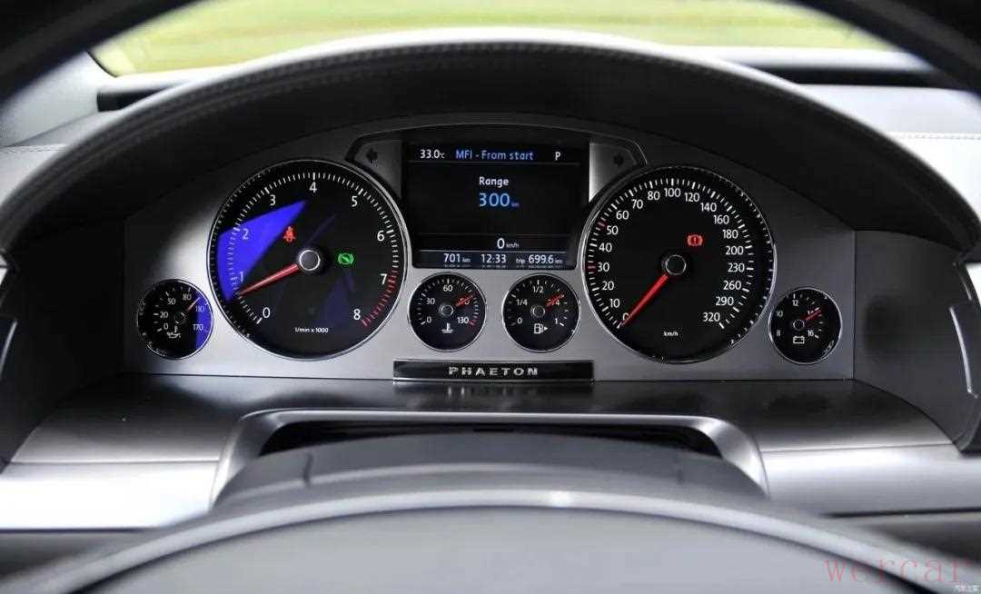 仪表盘虽然不是液晶的,但金属边框点缀的仪表盘格外富有质感。除了精致的金属点缀,仪表盘下方还有“PHAETON”字符的辉腾铭牌,时刻提醒驾驶员驾驶的是大众的顶级车系。
