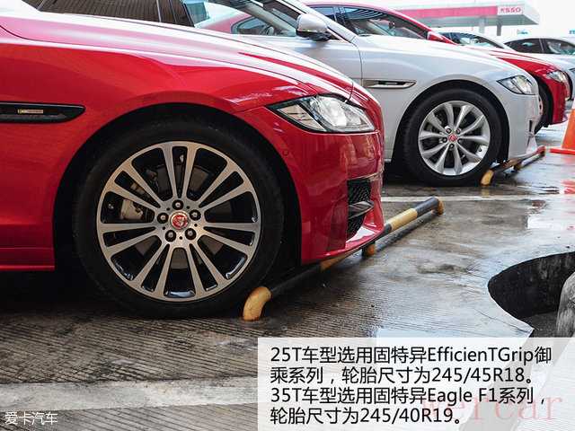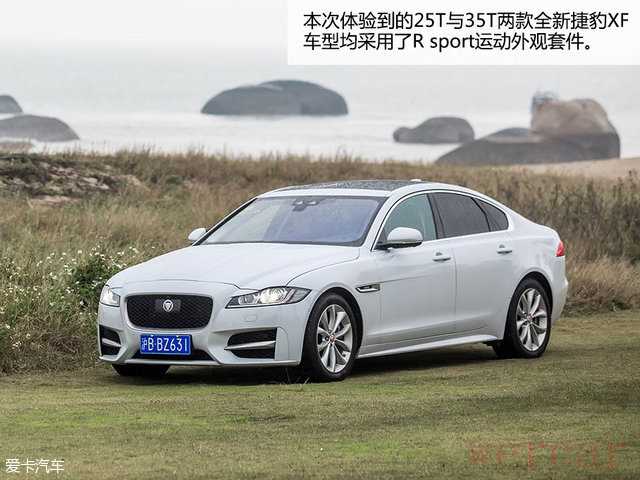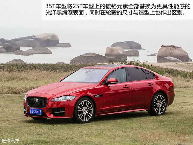 本次体验到的25T与35T两款全新捷豹XF车型均采用了R sport运动外观套件,二者的主要区别在于35T车型将25T车型上的镀铬元素全部替换为更具性能感的光泽黑烤漆表面,同时在轮毂的尺寸与造型上也作出区别,其他部分并无二致。