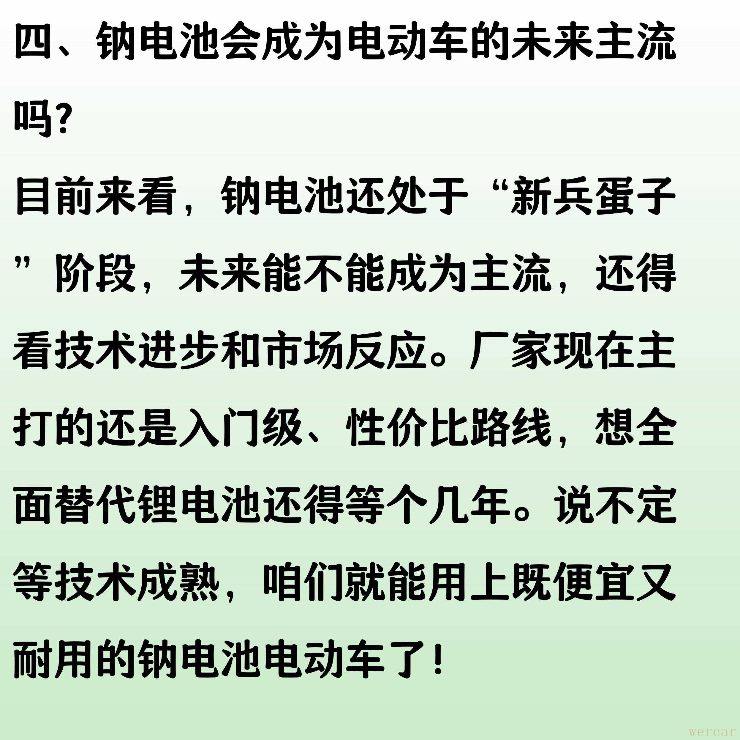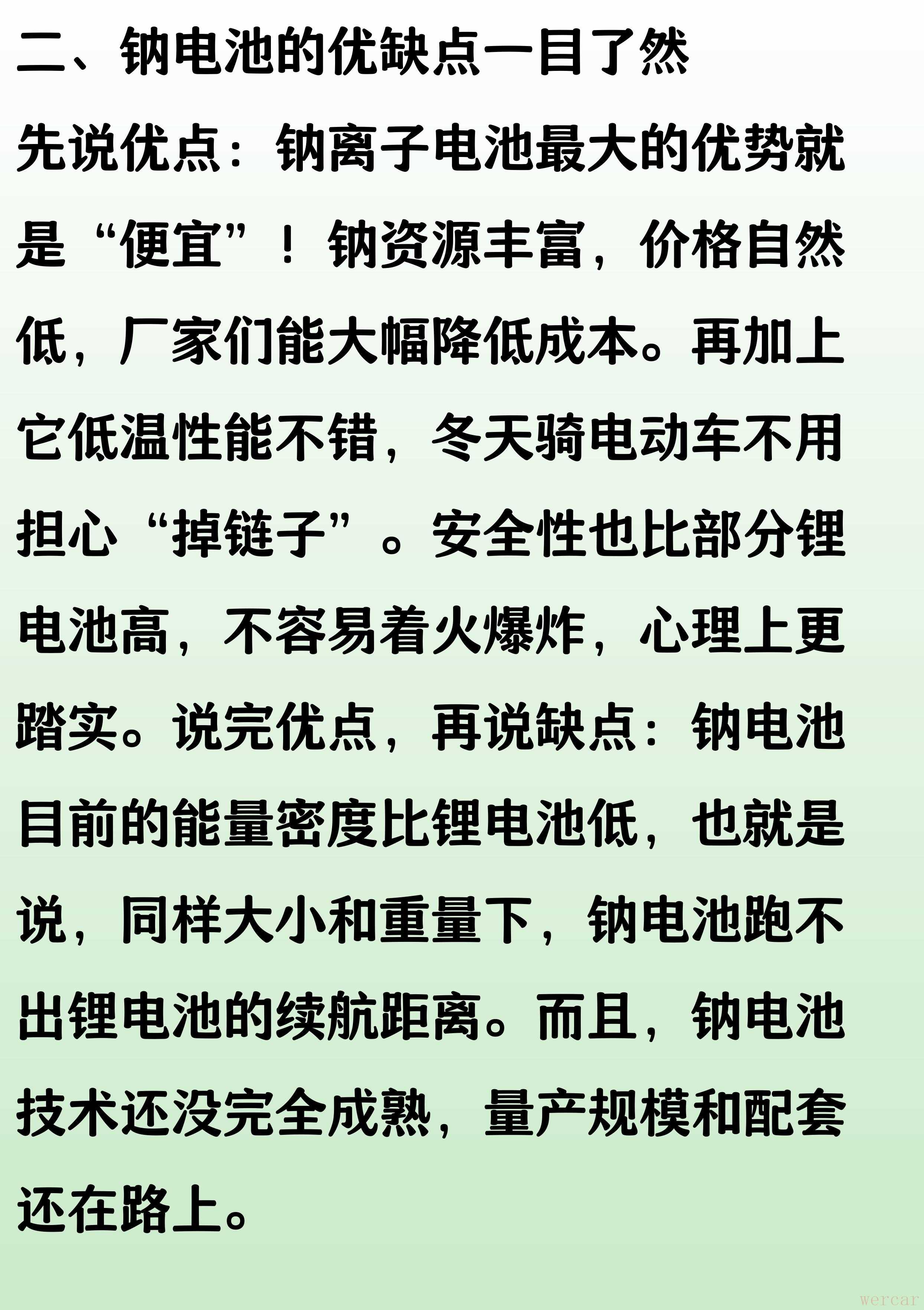 "能量密度:" 钠离子 ≈ 磷酸铁锂 (LFP) 或 略低。意味着同样重量/体积,续航可能稍短。