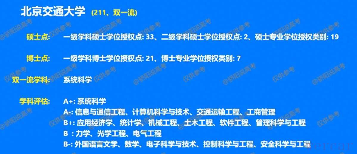 "学科优势突出:" 北交大的核心优势在于"交通运输工程"及其相关领域。其"交通运输工程学科"长期位居全国第一,是公认的该领域的顶尖学科。除了王牌的交通运输,其"信息工程、电气工程、土木工程、经济与管理"等学科也实力强劲,特色鲜明。