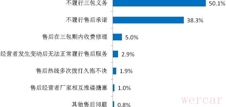 具体来看,涉及汽车售后问题的投诉主要包括:不履行三包义务、不履行售后承诺、售后在三包期内收费修理以及经营者变动导致无法正常履行售后服务等,其占售后问题比重分别为50.1%、38.3%、5.0%和2.9%。