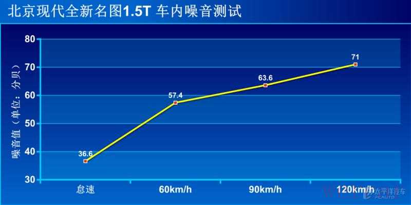 北京现代全新名图在噪音测试中表现并不是非常优秀,虽然在怠速时,车辆始终能够保持在36.6dB左右,但当车辆时速上升至60km/h后,便达到了57.4dB,这个表现与目前第一梯队的自主品牌车型也是有差距的,而当车辆达到90km/h后,分贝仪则显示为63.6dB,120km/h为71dB,此时大部分的噪音来自于风噪和胎噪,所以高速行驶时全新名图的NVH表现并不是很完美。