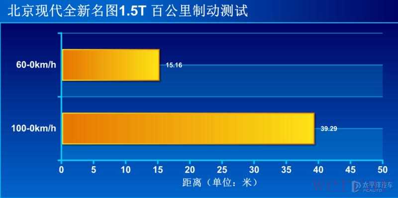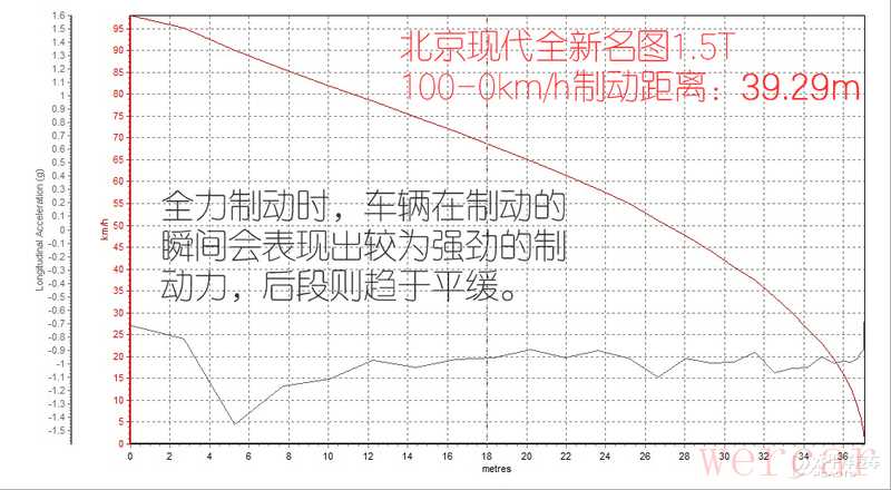 全力制动时,车身的前倾幅度并不是很大,所以前轮的负荷并不算超标,坐在主驾驶位也不会感受到明显的抛离感,轮胎与柏油路面的摩擦力属于正常水平。因为气温的缘故,ABS系统的工作介入时机准确,并且车轮在全力制动的瞬间没有出现抱死现象,整体姿态的表现中规中矩,最终测得100-0km/h制动距离为39.29m,属于同级别中等的水平。