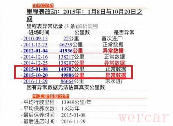 宋先生提供的保时捷4S店查询的记录显示,涉事车辆在其购买前的2011年6月和2013年5月,分别有两次水泡维修施工项目记录;2014年2月则有校正两后大梁的维修记录。此外,这辆保时捷在2012年1月、2014年12月以及2015年10月20日(购车前一天),还出现过里程表异常改动的情况。
