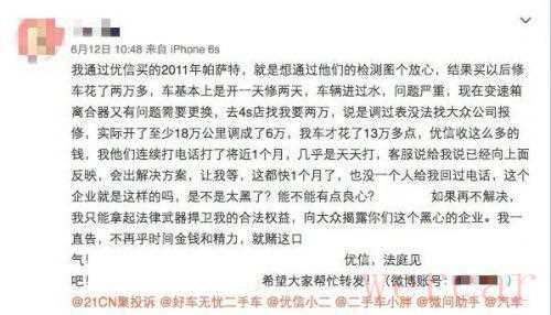 6月16日,新浪科技曾报道,车主陈先生在优信二手车平台花13万元购买一辆2011年款帕萨特,后发现是辆“事故车”,车辆不仅进过水,变速箱离合器也有问题。“现在修车已经花了两万多,车基本上是开一天修两天。”据陈先生介绍,因为车辆调过表(实际开了至少18万公里调成了6万),无法找大众公司报修,更换变速箱4S店要价2万。