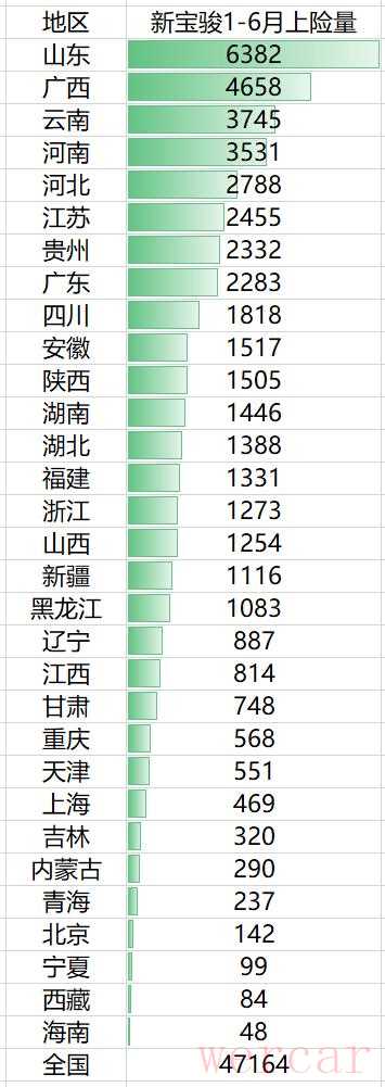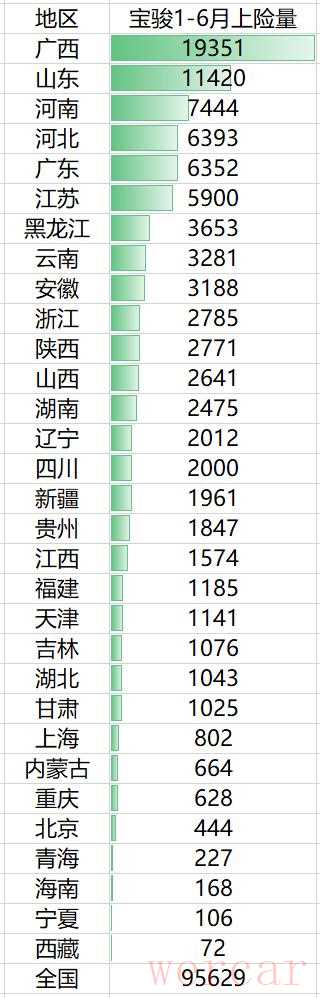 至于宝骏,最大的区域市场不是人口最多的省份、也不是经济最发达、整体规模最大的省份,而是它的总部所在地——广西,并且其在该省上半年19351辆的上险量,远远超过第二大市场山东,在宝骏品牌的占比超过了20%。