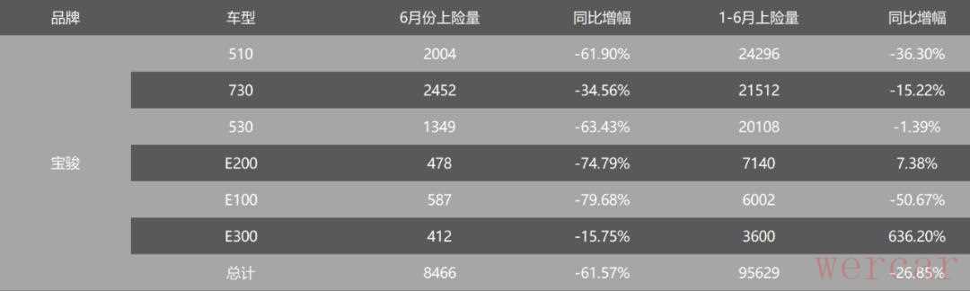 宝骏品牌在近两年都没有推出全新的燃油车型,旗下除了3款E系列电动小车外,都是510、730、530等一系列“过气神车”,E200、E300因上市较晚、在1-6月累计上险量上实现同比正向增长,但单看6月份单月的数据更能反映出宝骏的现况。