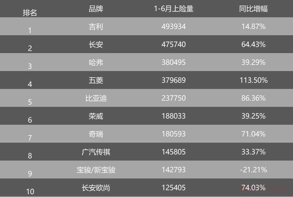 上表统计了今年上半年,自主阵营中新车上险量排名前十的品牌,可以看出上险量超过40万辆的只有吉利和长安,30-40万辆之间的只有哈弗和五菱,而在前五之后,其它品牌上半年的上险量都在20万辆以下。