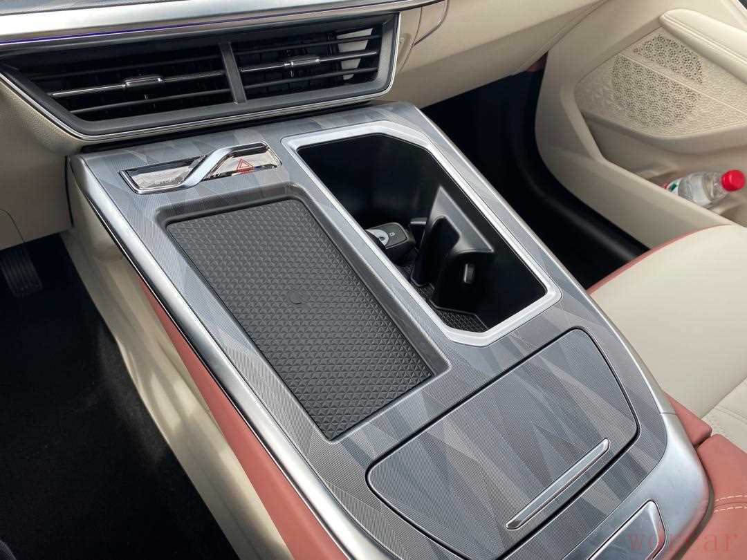 由于去除了大量实体按键,长城在哈弗神兽中央扶手板上只留下了一键启动和双闪应急灯的按键,取按键而代之的则是手机无线充电板和多个储物格,不知道这样的取舍各位喜欢吗?