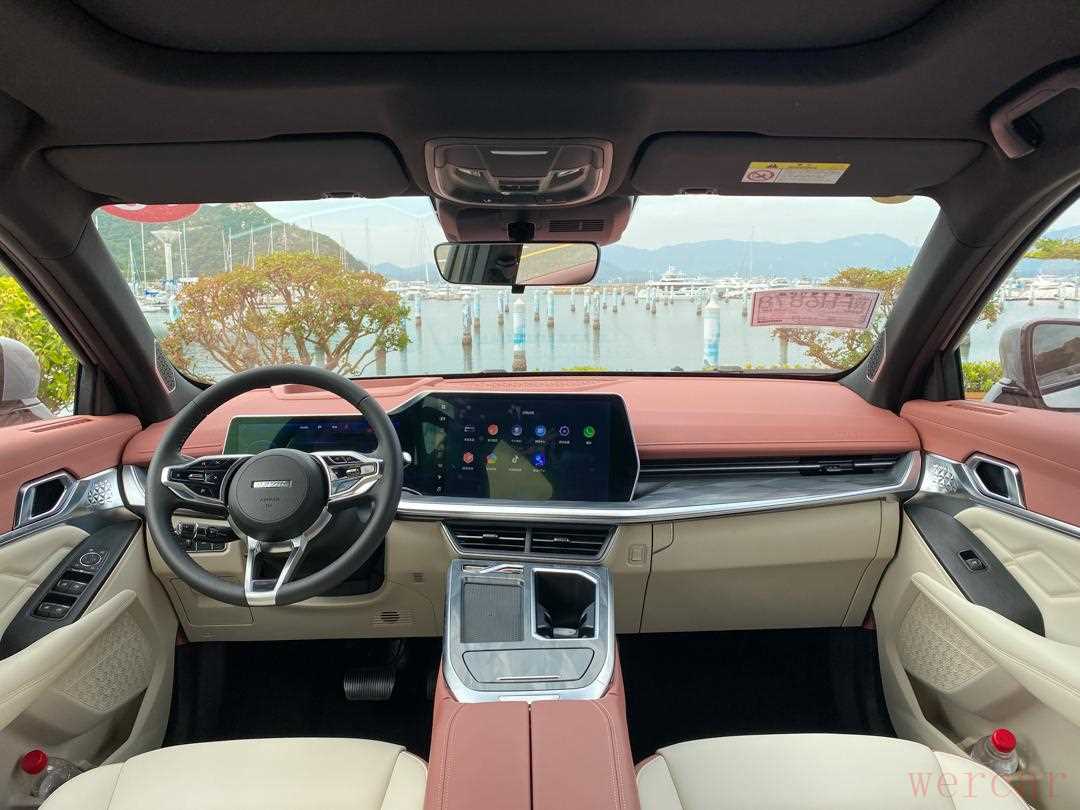 如果说外观已经有一定的视觉冲击力,那么哈弗神兽的内饰更是会让你吃惊的,因为它彻底抛弃了其他哈弗车型上的造型设计,而是采用了由12.3+14.6英寸双联屏所主导的布局,在去按键化及活跃的配色加持下,整体有着不错的科技感。