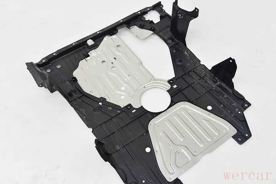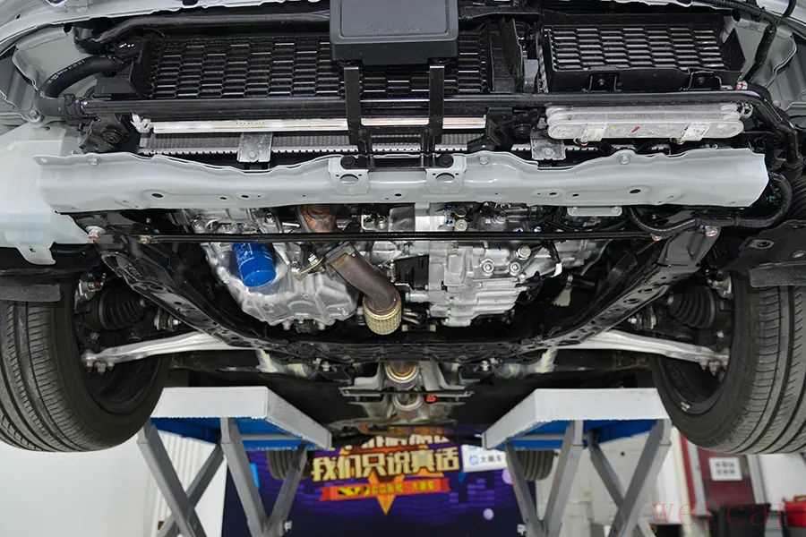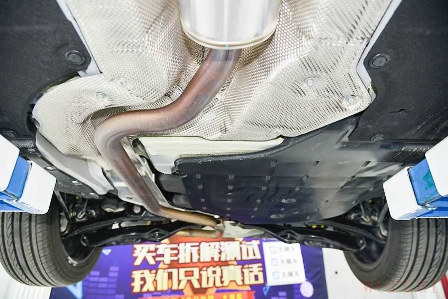 底盘平整度相当不错,有大面积的发动机下护板,大面积的铝合金护板,还预留了机油维护口。