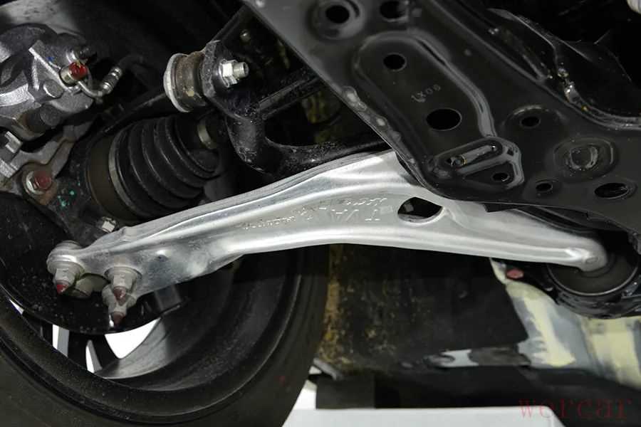 后悬是常见的“三横一纵”四连杆结构,由一根冲压钢板下摆臂、一根下控制臂、一根上控制臂及一根冲压钢板纵臂组成,不过后轮连接盘倒是采用了铝合金材质。