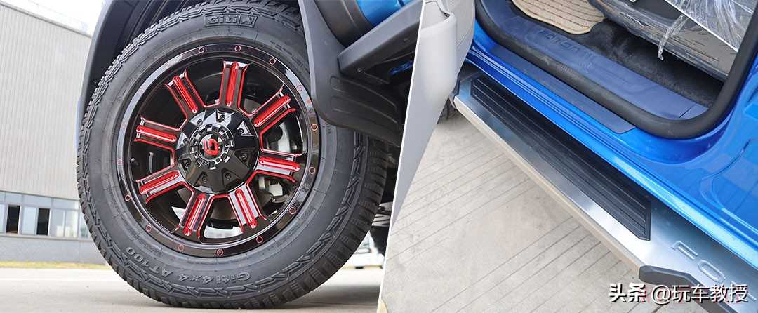 为了方便乘客上下车,车身侧面还配置了踏板。红色的多辐式轮毂看上去很是招摇,配备了佳通4×4 AT100轮胎,规格为265/60 R18。