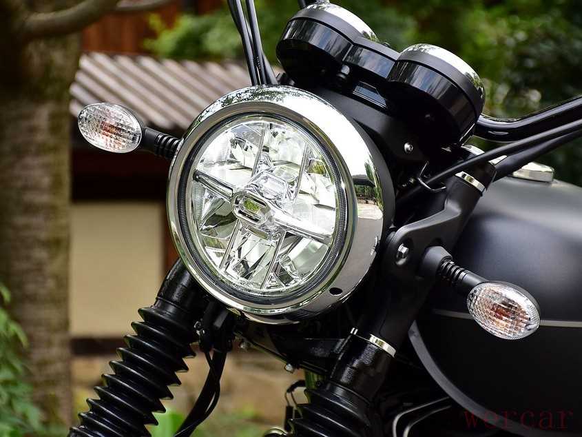 W800 Cafe的大灯设计感更强,赛车整流罩风格的金属灯罩展现出了Café racer车型独特的魅力,不仅复古气息浓郁,其小风挡也能起到一定的导流作用。