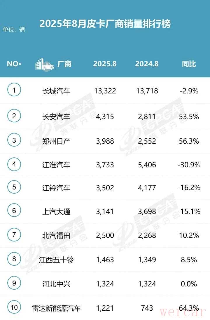 根据乘联会公布的国内皮卡市场销量数据,今年8月郑州日产在各皮卡厂商销量排名中位列第3名,仅次于长城汽车和长安汽车,共售出3988辆,同比增长56.3%。