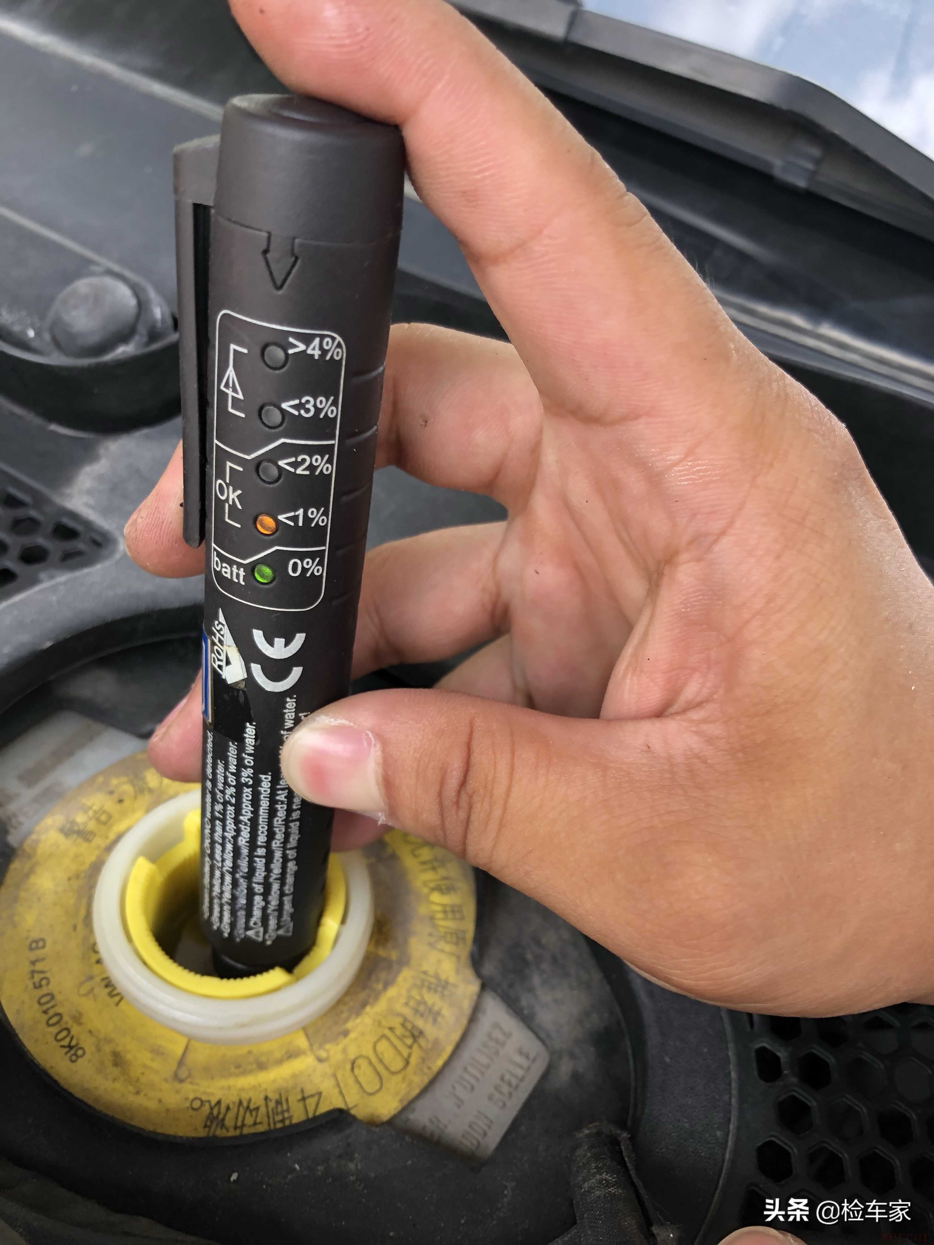 接下来对全车油水进行检测,刹车油目前还可以正常使用,后期需留意刹车油含水量情况。如果长时间不更换,导致刹车油水分超标,刹车油的沸点降低,影响制动效果,给行车带来一定的安全隐患。