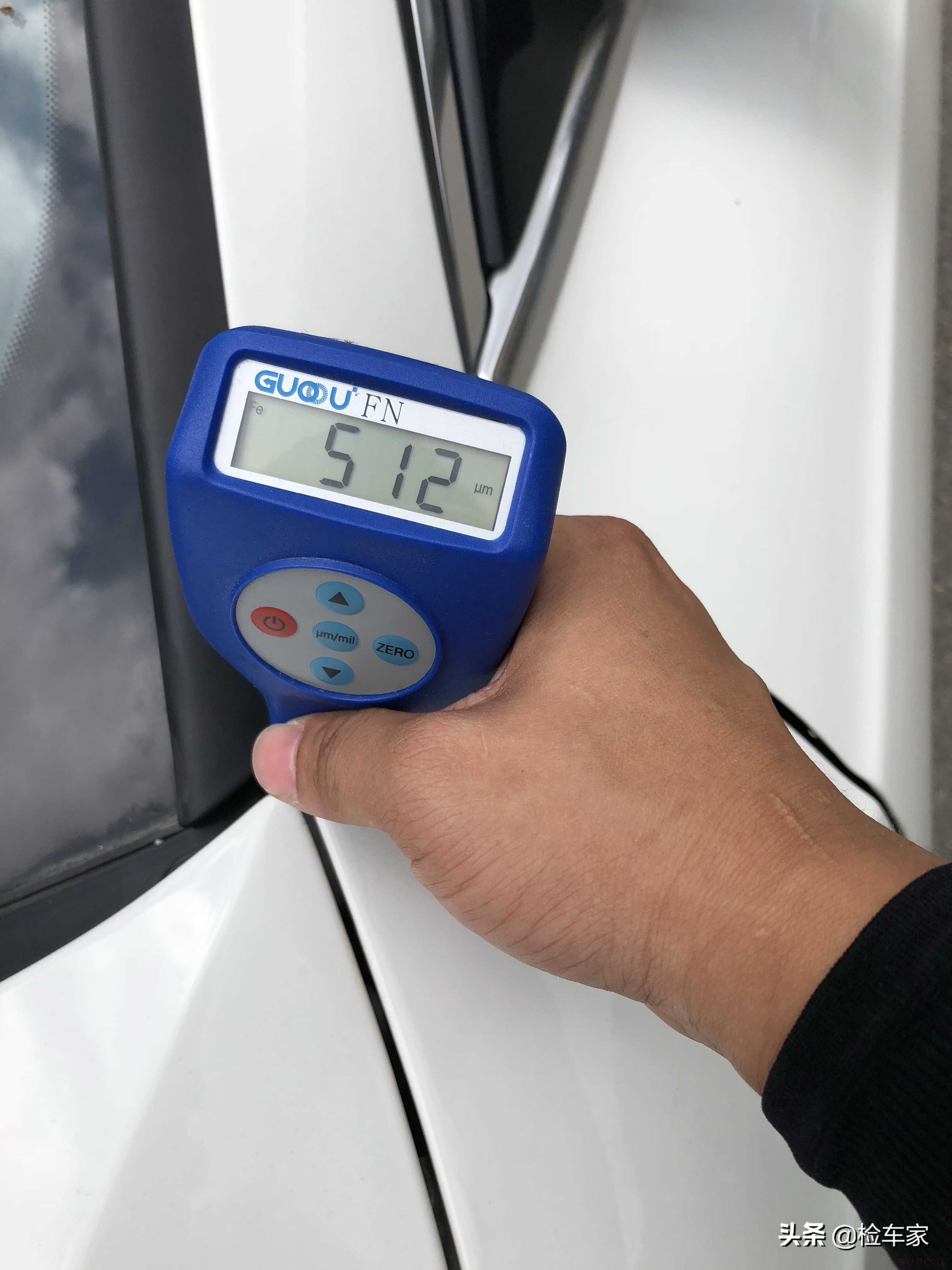 检测到左A柱底部的时候,发现数值为512um,有轻微钣金修复,我心里一凉,感觉这不是小事故那么简单。但是这个位置也有可能是机盖受伤后碰到了A柱导致A柱修复,无论哪种情况都可以说明这台车前部至少是撞过,就是需要验证一下事故的大小而已。