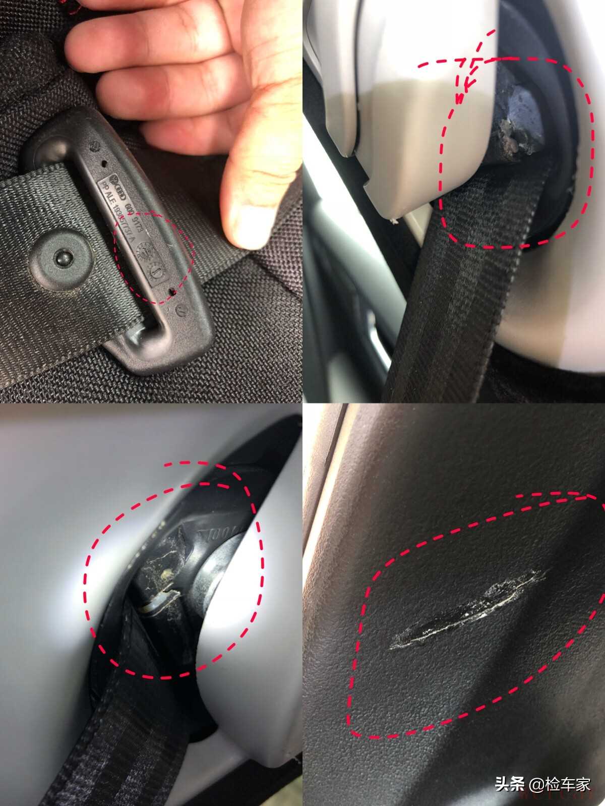 随后检测安全带生产日期与原车日期相符,但是我从内部发现安全带螺丝有拆卸及内部卡扣断裂,而且B柱装饰板开裂重新打胶密封。检测到这里大家应该明白了吧,安全气囊及安全带都爆过。