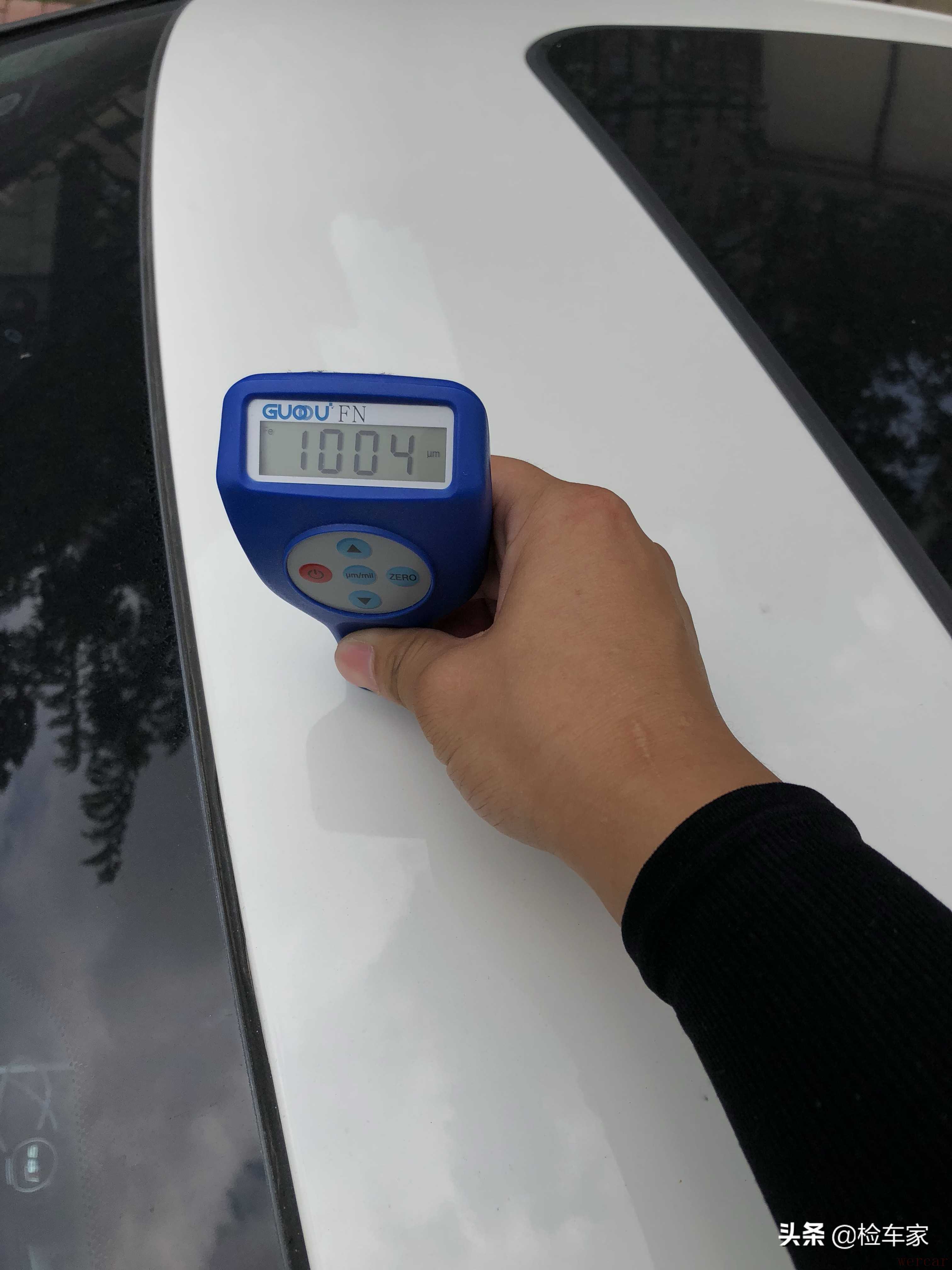 检测大顶漆面数值的时候,数值高达1004um,很明显有过钣金修复,仔细检测发现钣金范围还不小,所以小宝可以判定前挡风玻璃更换跟这有着一定关系。