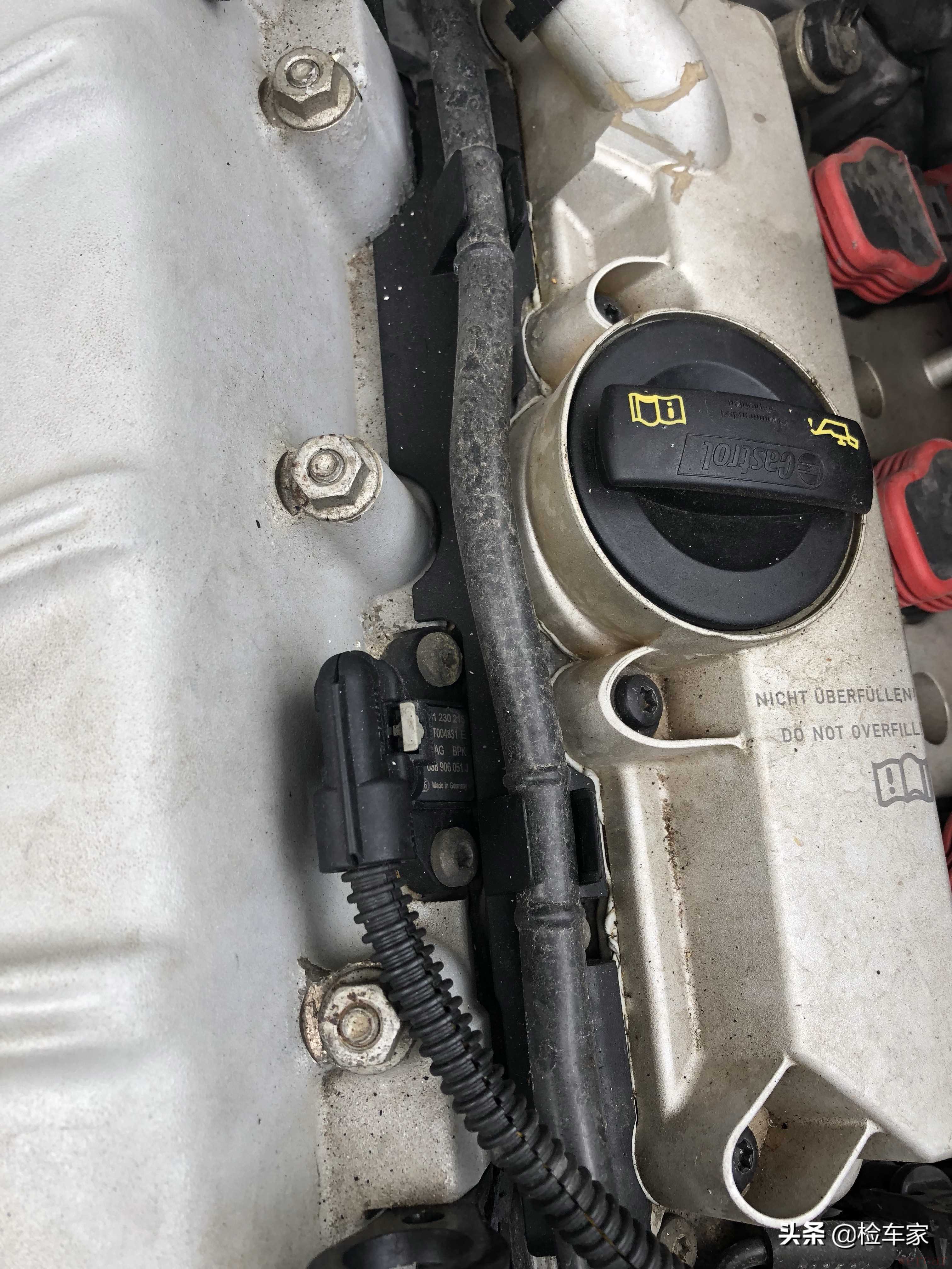 接下来对发动机总成进行检查,发现气门室盖有重新打胶密封痕迹,目前没有渗油现象,对于一个4年的德系车来说,这种情况也见怪不怪了。其他地方并没有发现异常,发动机附属件正常拆卸维修。