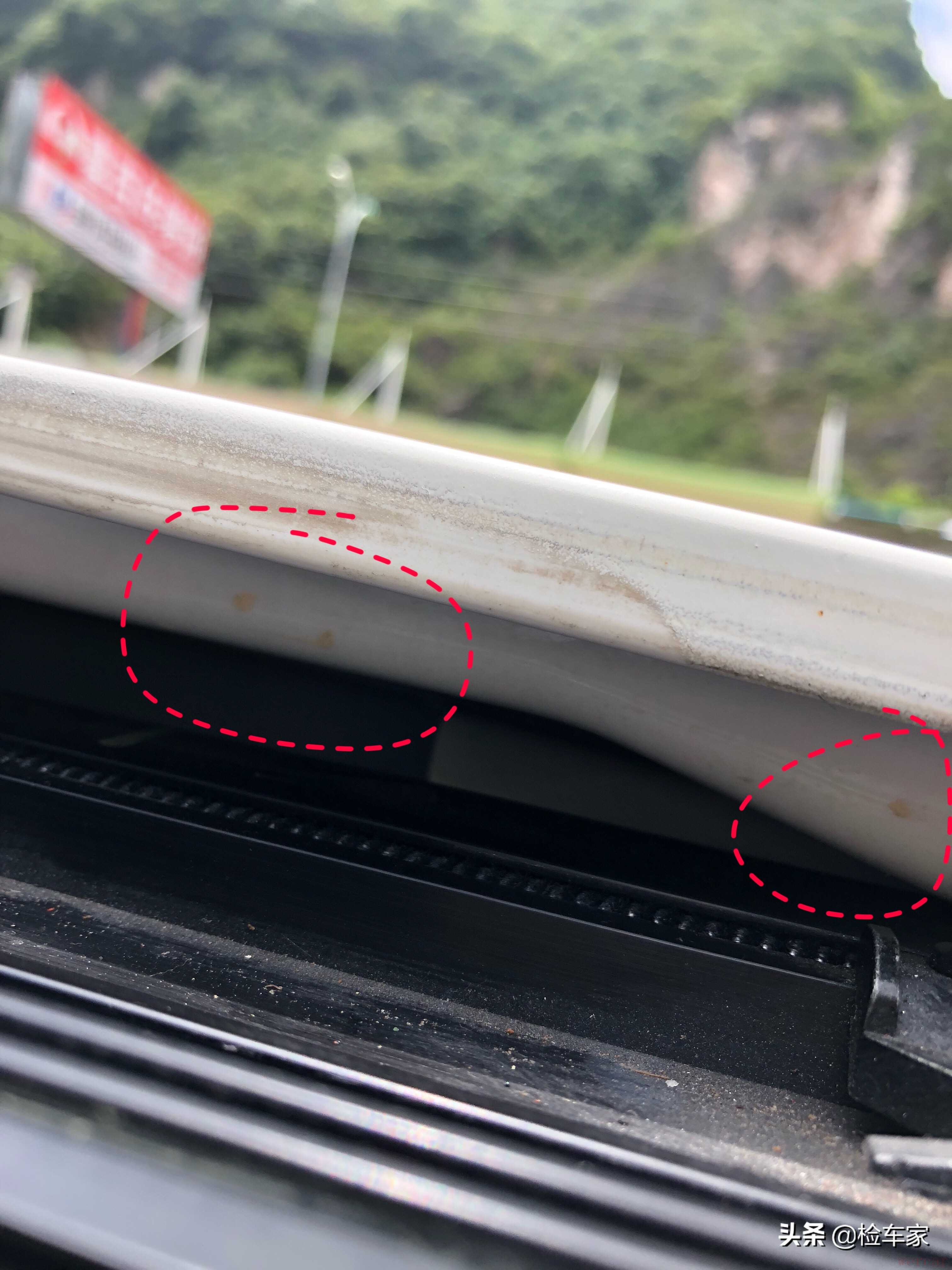 来到车内,小宝打开天窗观察大顶情况,发现大顶确实有过钣金修复,一些残留的飞漆及腻子粉都在里面都未处理干净。