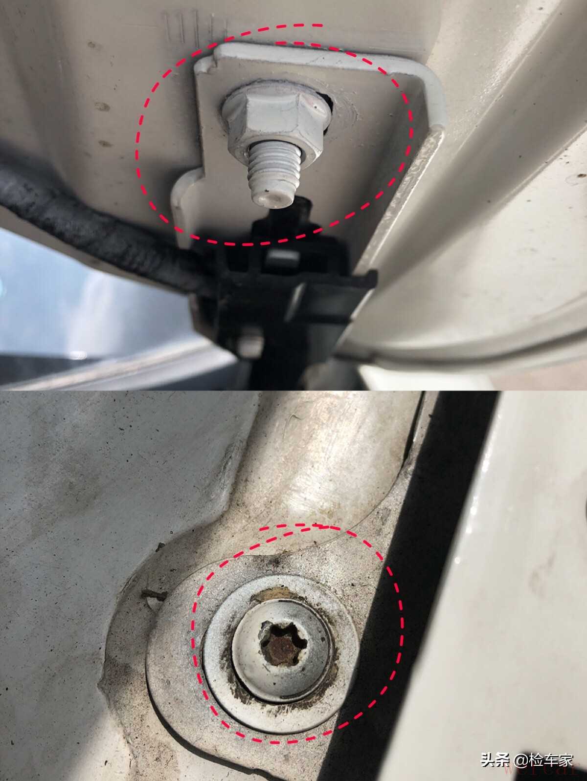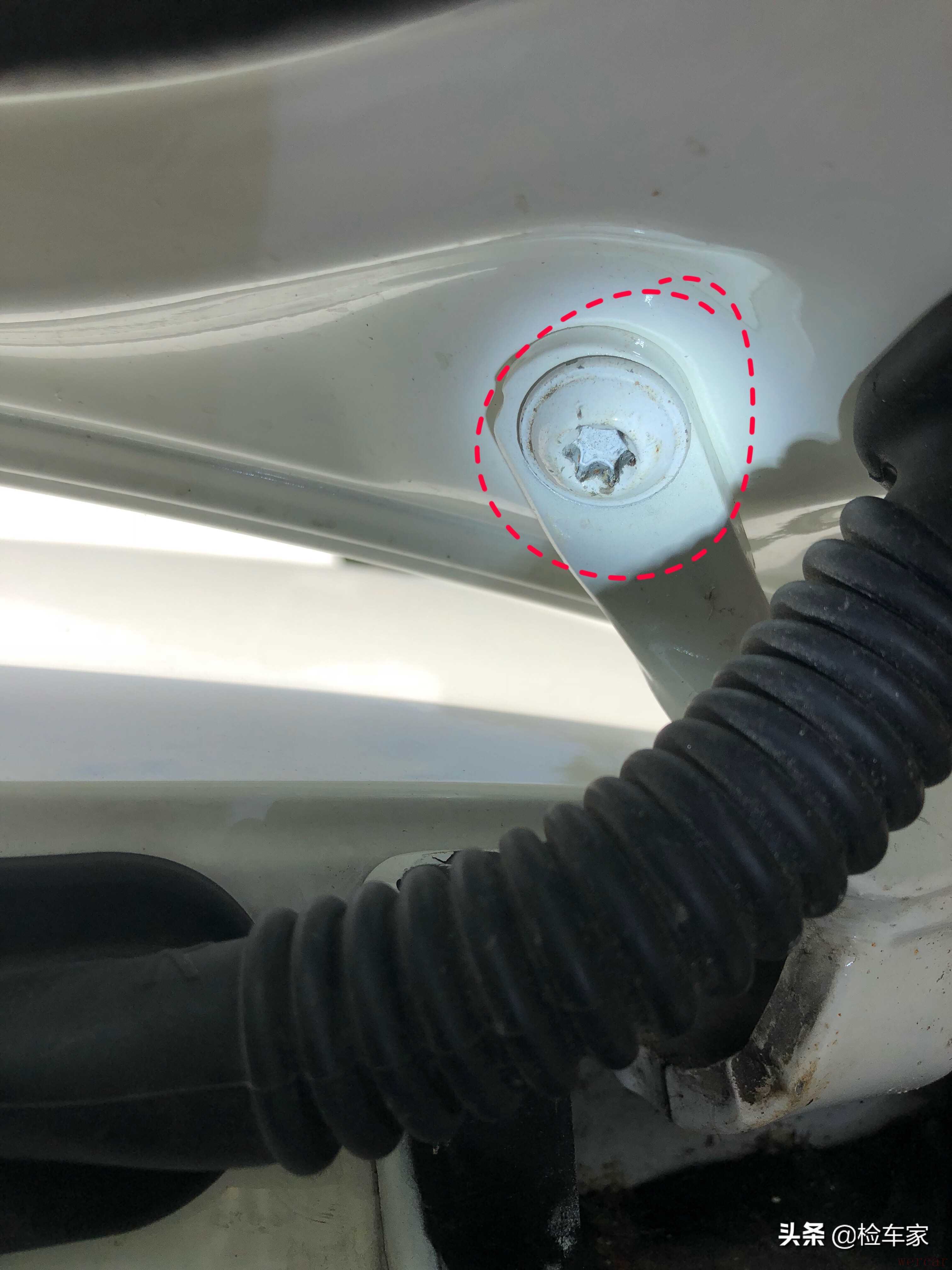 打开发动机舱,不用看都知道机盖螺丝有拧动痕迹且螺丝有位移,左侧叶子板螺丝有拆卸痕迹。但结合漆面检测推断机盖并没有发现有过更换,都只拆卸做了钣金修复。